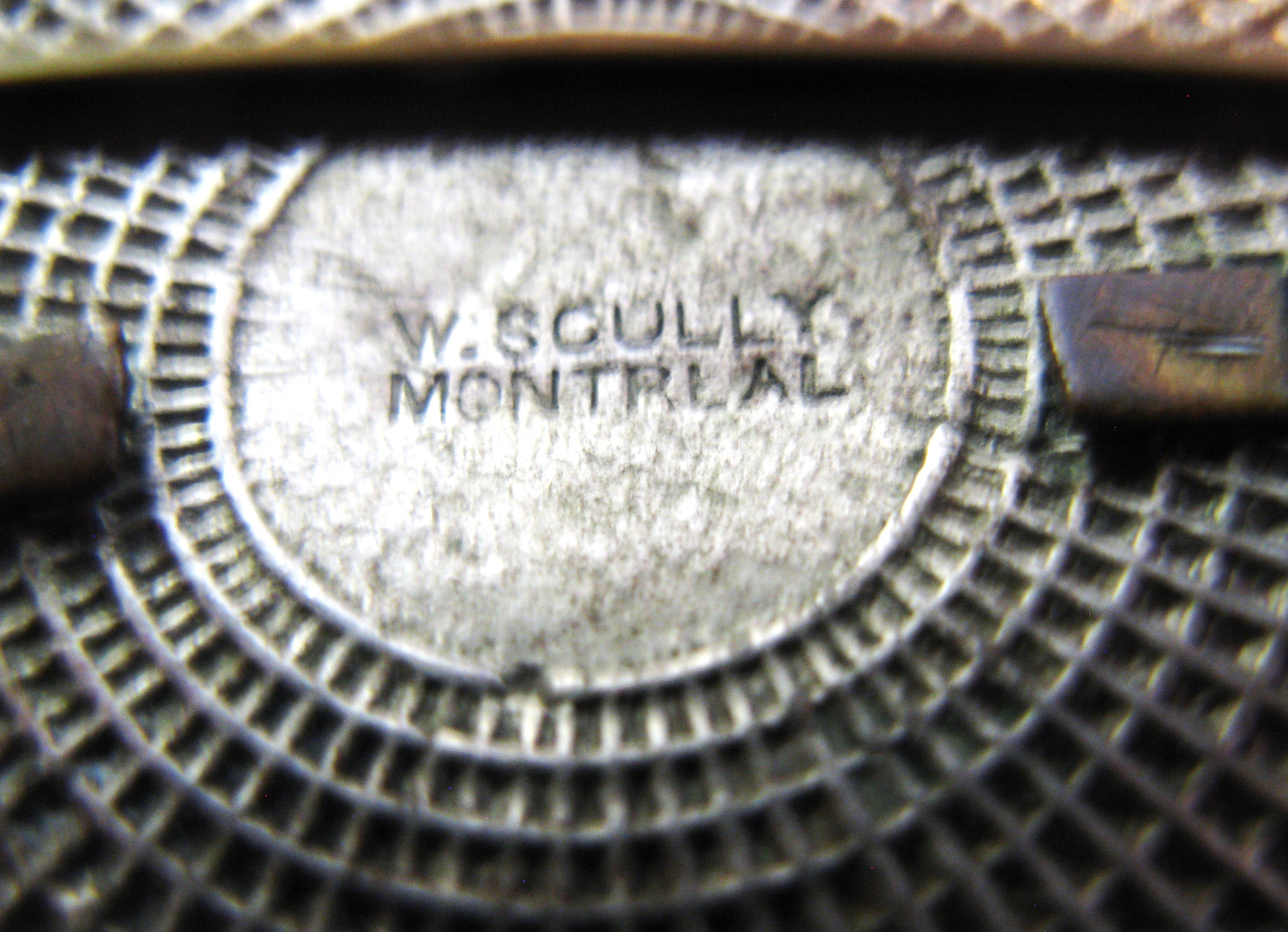 This badge is bi-metal with copper & white metal. Both original lugs are intact and in good order. Comes with its cross pin as found. The badge is hallmarked "W.Scully- Montreal ". Has an George V cypher under the king's crown.