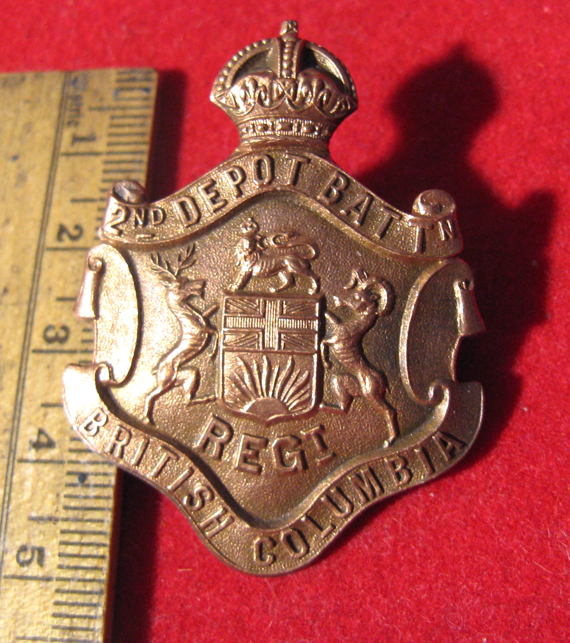 Above are the scans for this CEF 2nd British Columbia Depot Battalion Cap Badge.This beautiful badge is complete with both original flat style lugs in good order. An o/r copper badge in almost mint condition. A real beauty to enhance any collection of Canadian CEF badges.