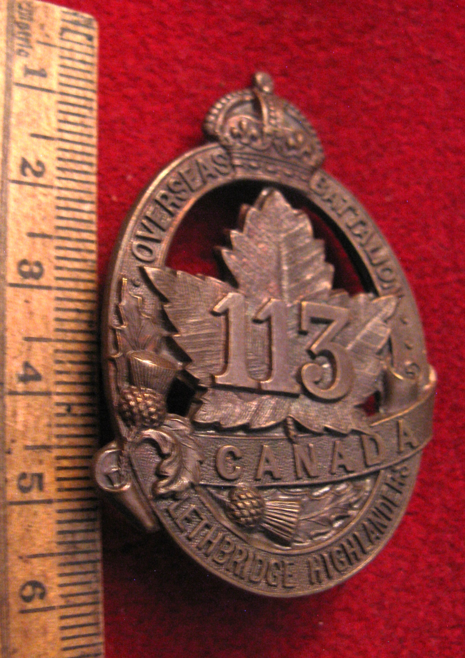 You are viewing a vintage CEF WWI era113th Battalion Cap Badge. Also known as the "Lethbridge Hihglanders". Both lug type attachments are original and in good order. A very hard to find badge from the CEF era of the beginning of the 20th century. This badge is made of fine highly detailed copper using the stamping method...