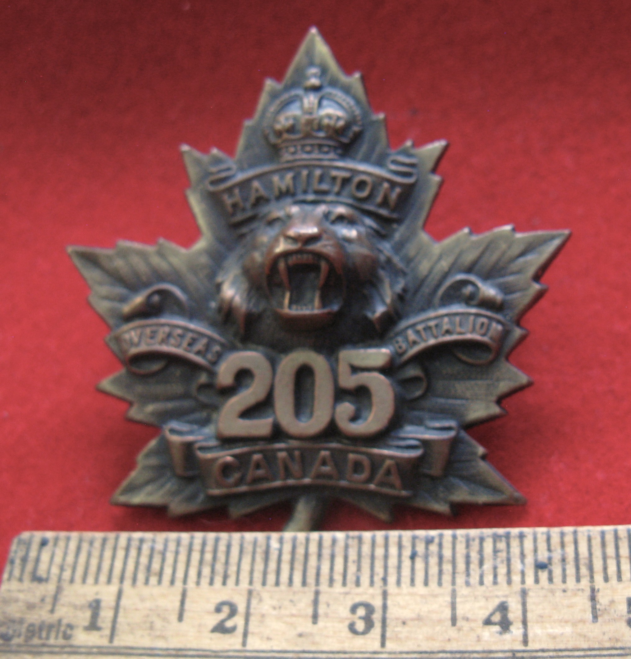 You are viewing a CEF WW1 205th Batallion Cap Badge. This badge is made of pickled brass. Complete with all original lugs, in good order, and quite wearable.