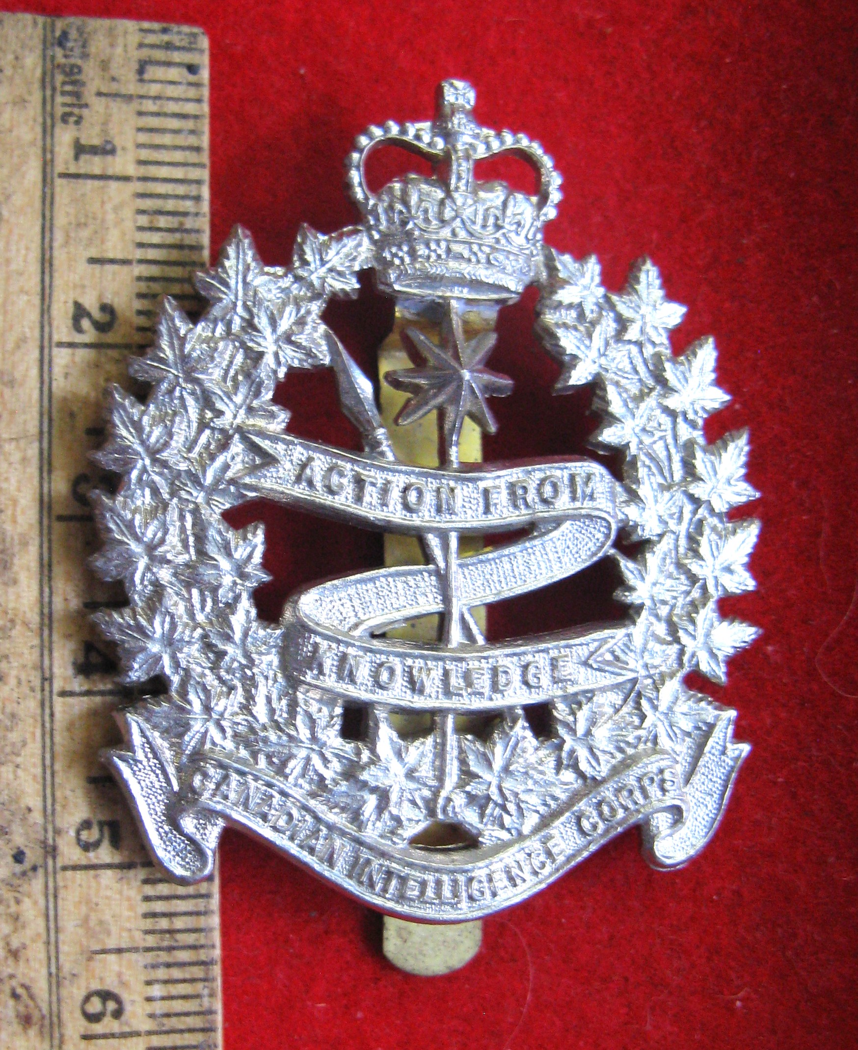 The scans above show a uniform badge for the Canadian Intelligence Corps. This cap badge is made of white metal, all in good condition with a tang type fastener. Note the interesting motto... "Action from Knowledge"..