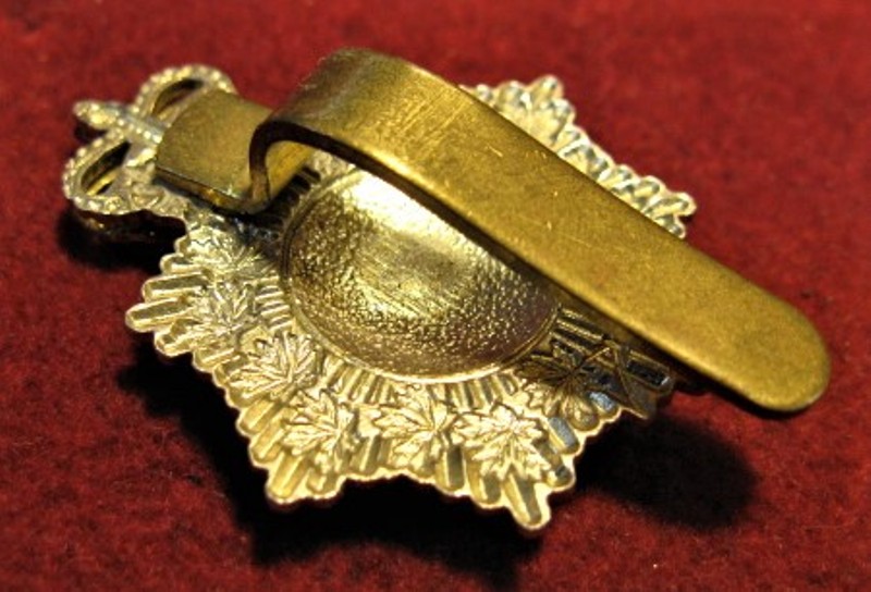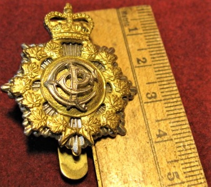 You are viewing the scans for this rare cap badge for the Royal Canadian Postal Corps. It is made of brass with a center overlay in white metal, all resting on an eight pointed white metal sunburst design. Still in excellent condition with its original tang type attachment in good order.