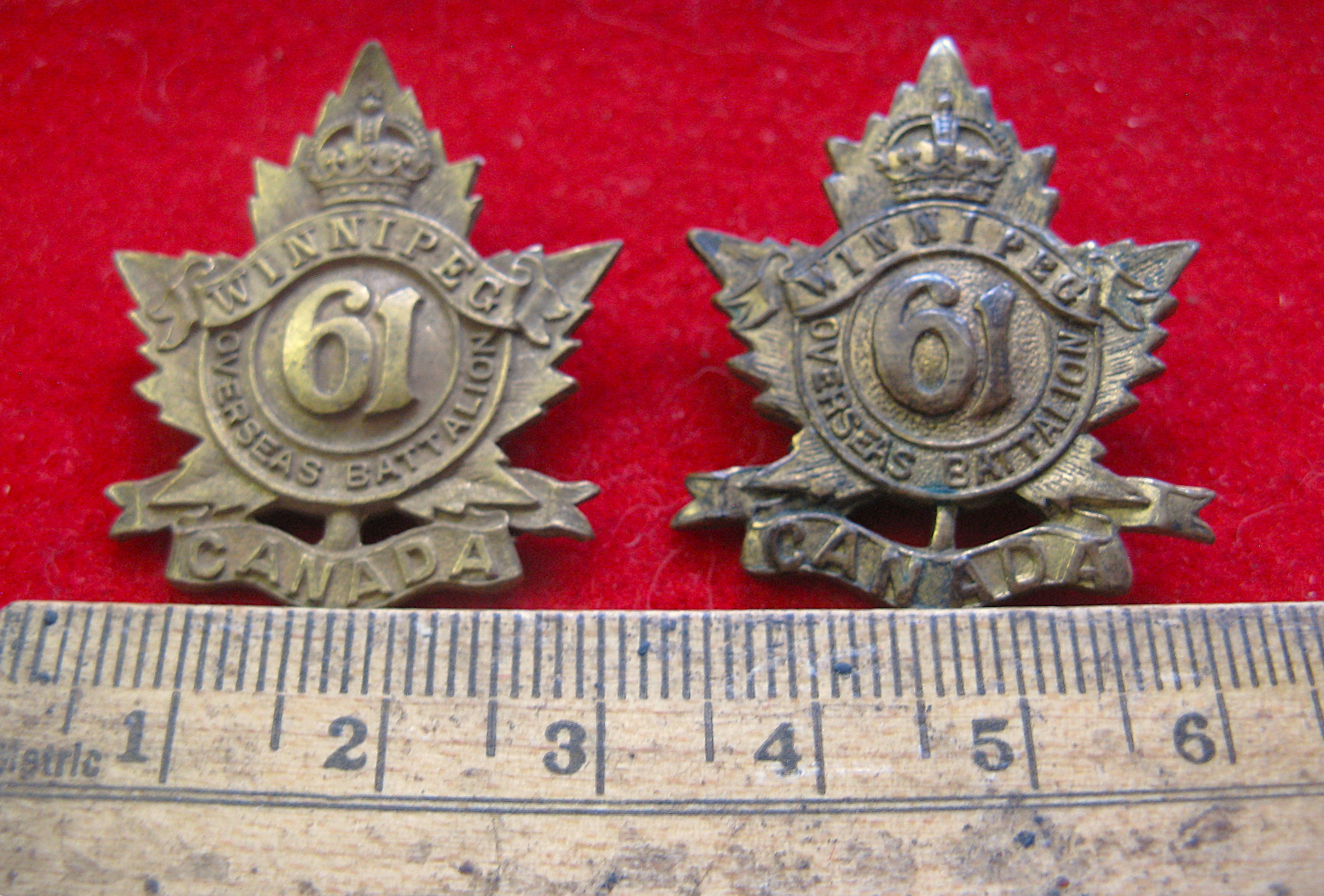You are viewing a WWI era collar badge set of two, for the 61st CEF battalion. Made of brass with crown over "Winnipeg" scrolling. Have some patina buildup but