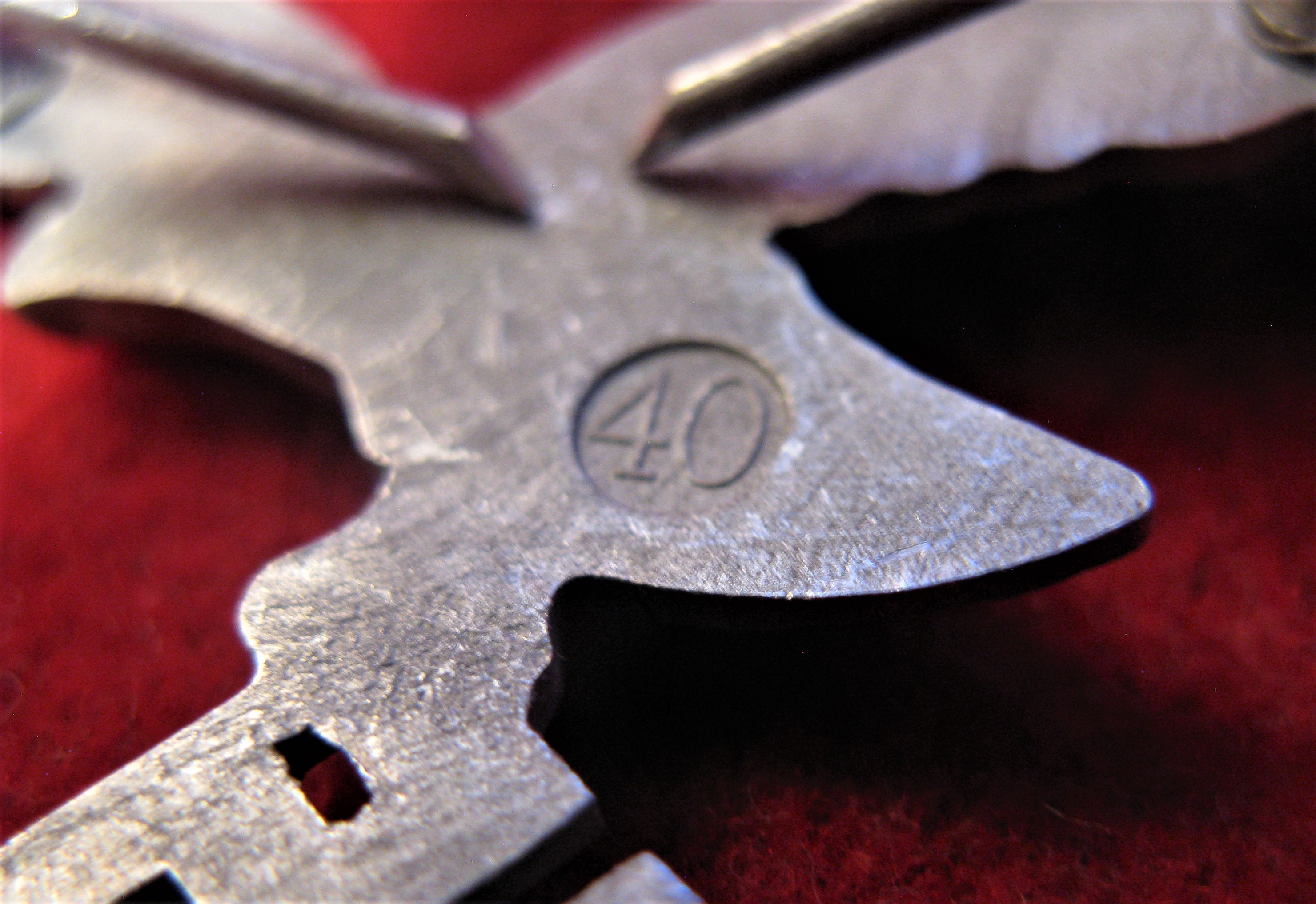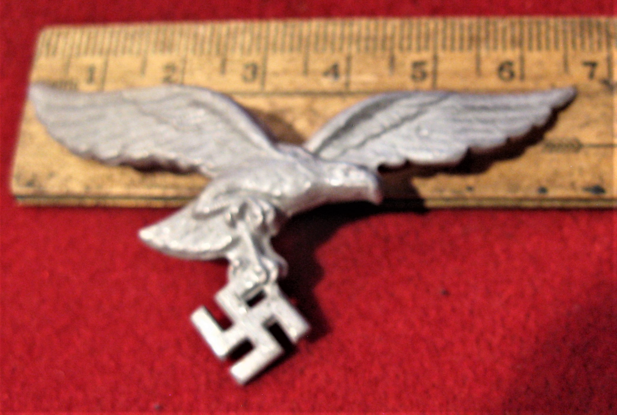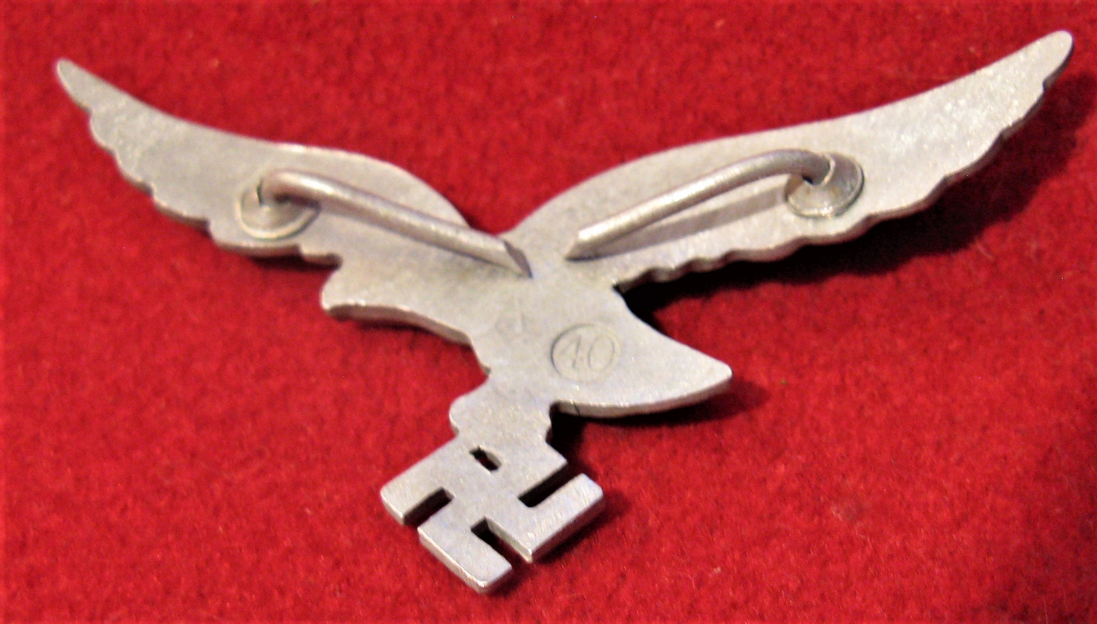 You are viewing a WWII era Eagle/Swastika Luftwaffe cap badge. It is a gray-toned version with the flying eagle clutching a swastika. Both of the wire clip-type attachments are original and in good order. Maker marked with a "40" inside a circle.. The badge is in excellent condition as is evident from the scans.