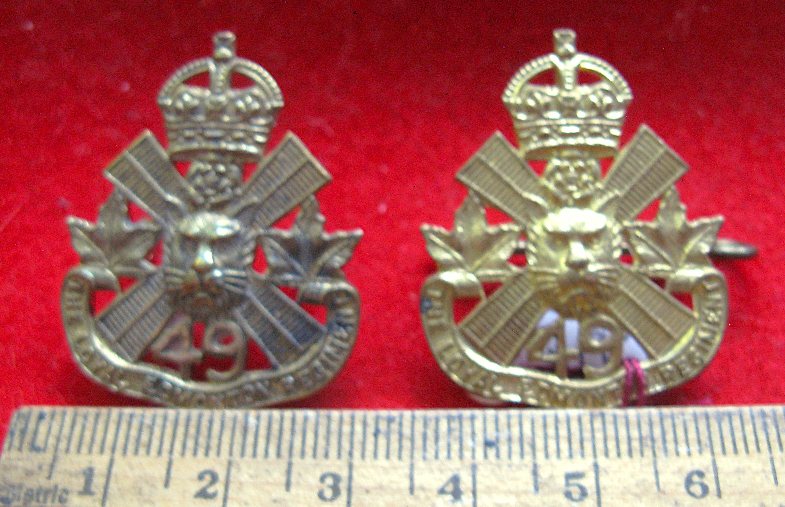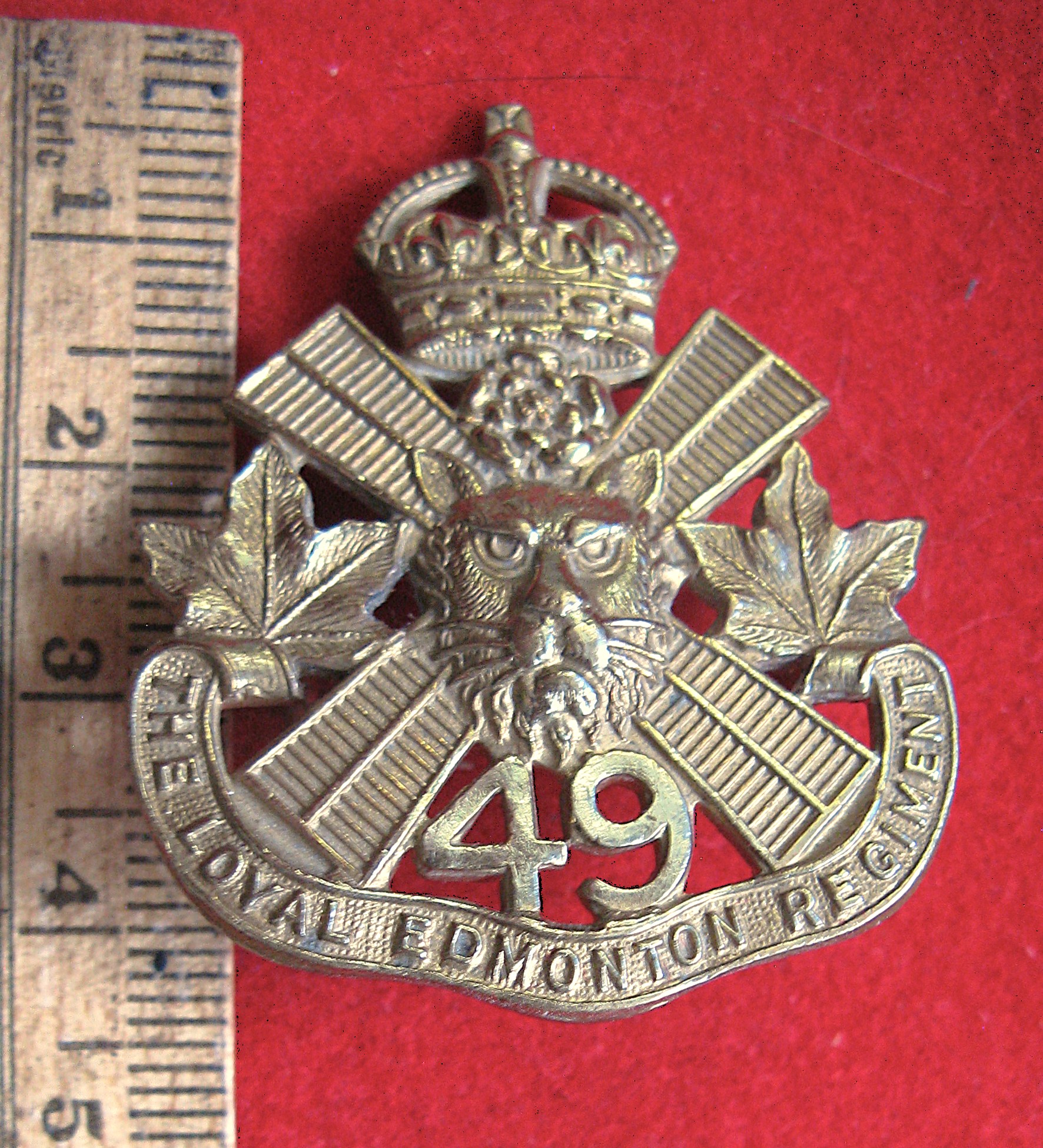You are viewing a vintage 49th Loyal Edmonton Regiment brass cap and collar badge grouping. Excellent overall condition made of brass. A clean collar badge set with both welded lugs original and with horizontal cross pins included.