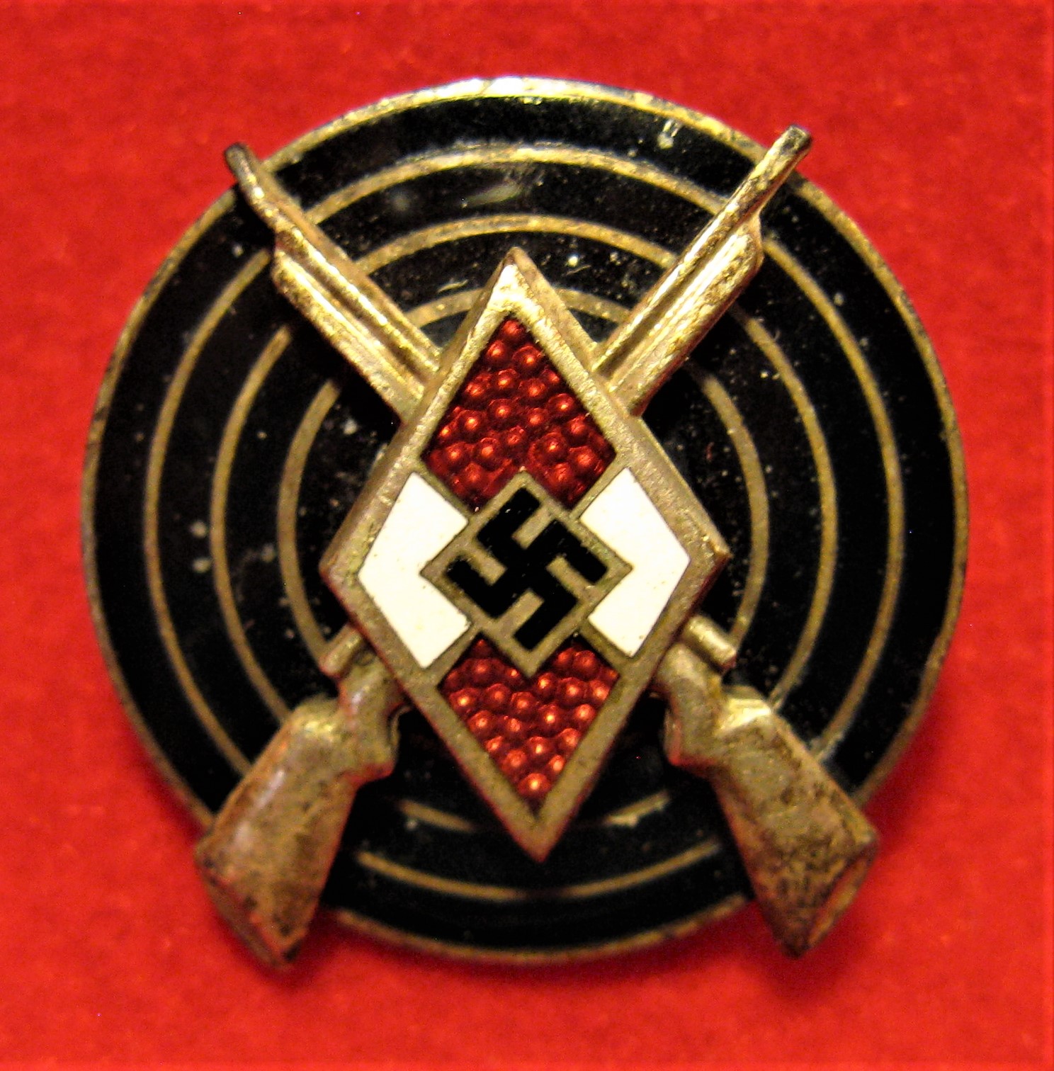 You are viewing a German WW2 Era Hitler Youth shooting award lapel pin. This one has its original cross pin intact and in good order. The badge is very good condition, with its enameling at 100%