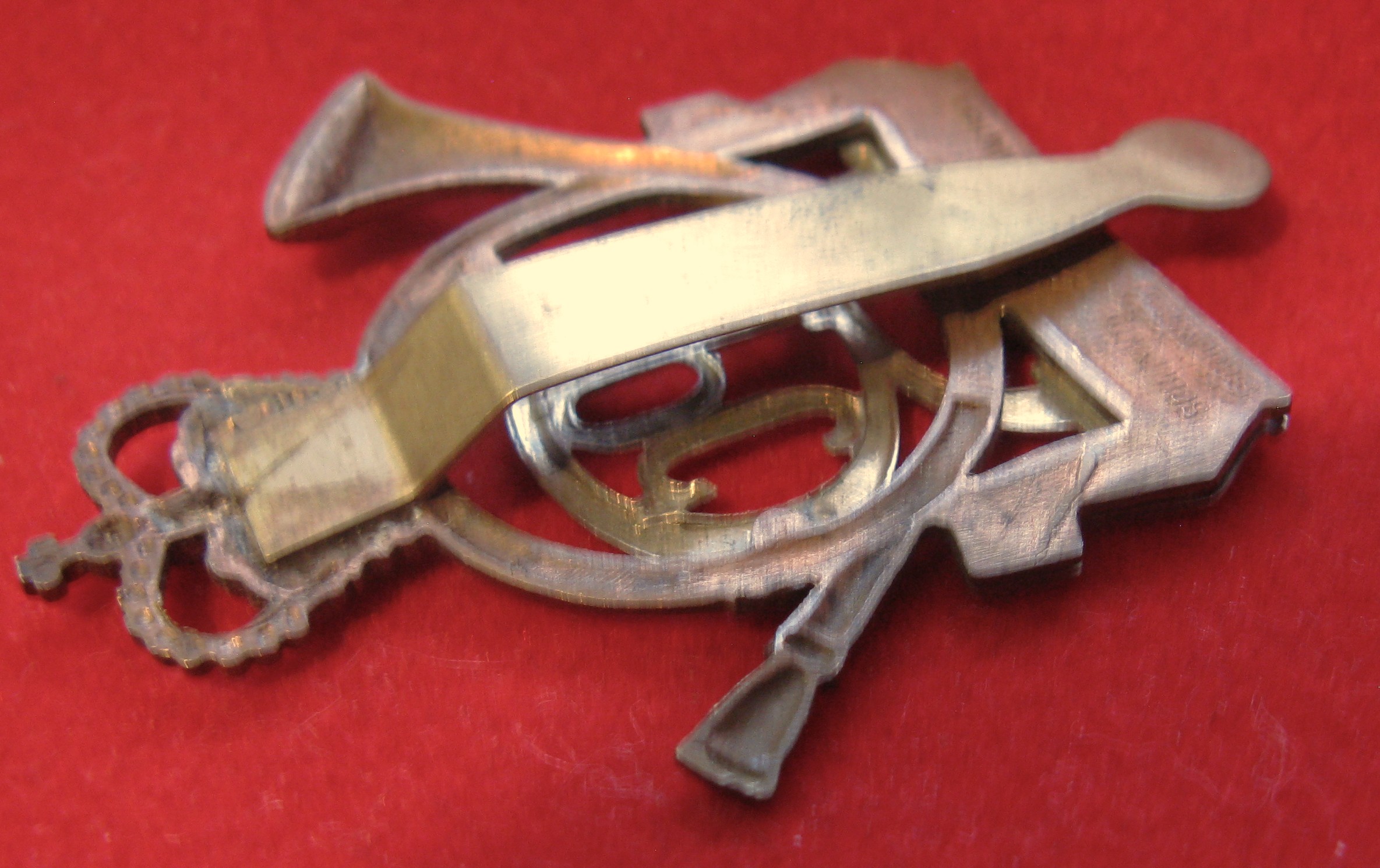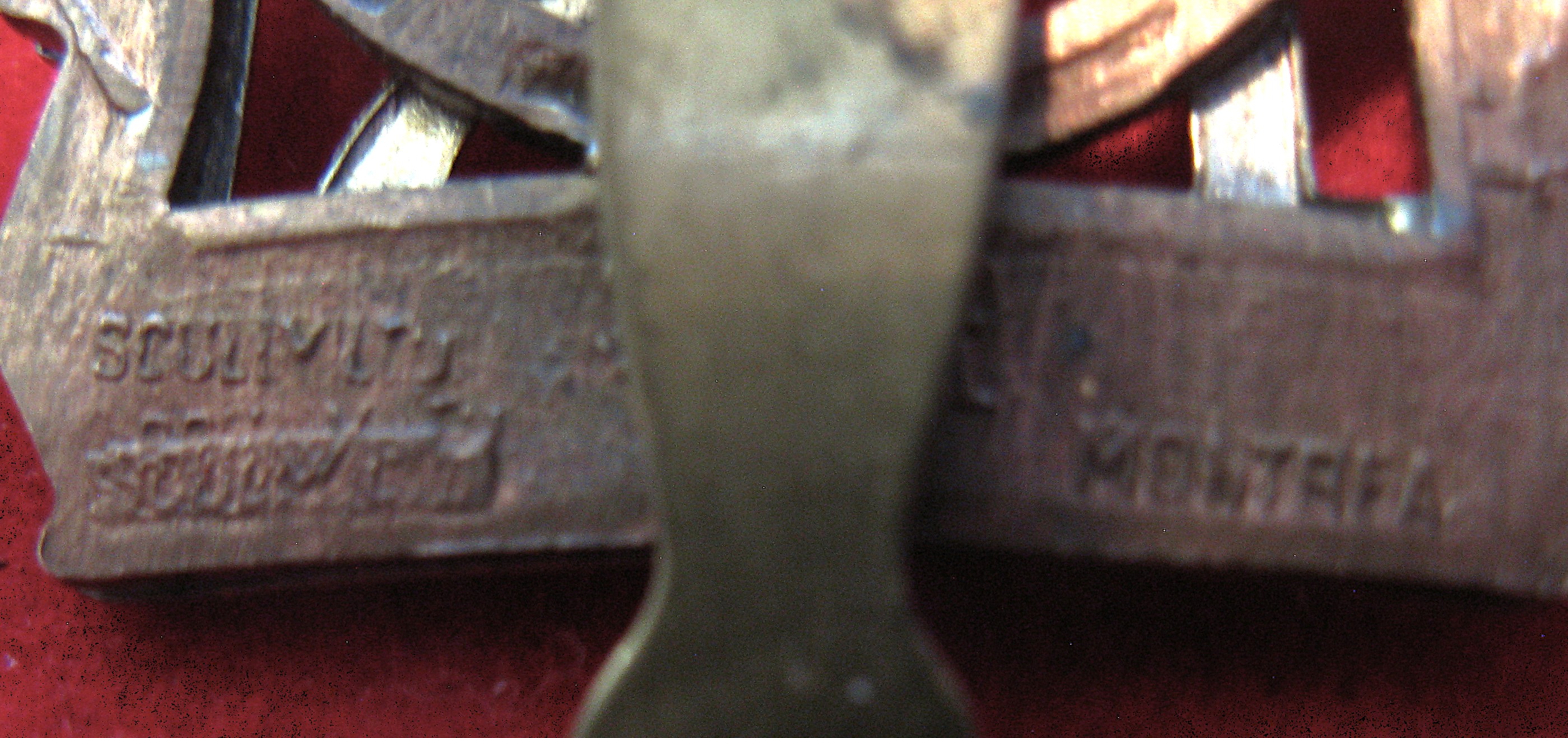 basic design being a queen's crown above an infantry-like horn. Also still possesses its long forgotten motto, "Servire Armatis". It is nicely hallmarked "Scully Ltd - Montreal" In excellent
