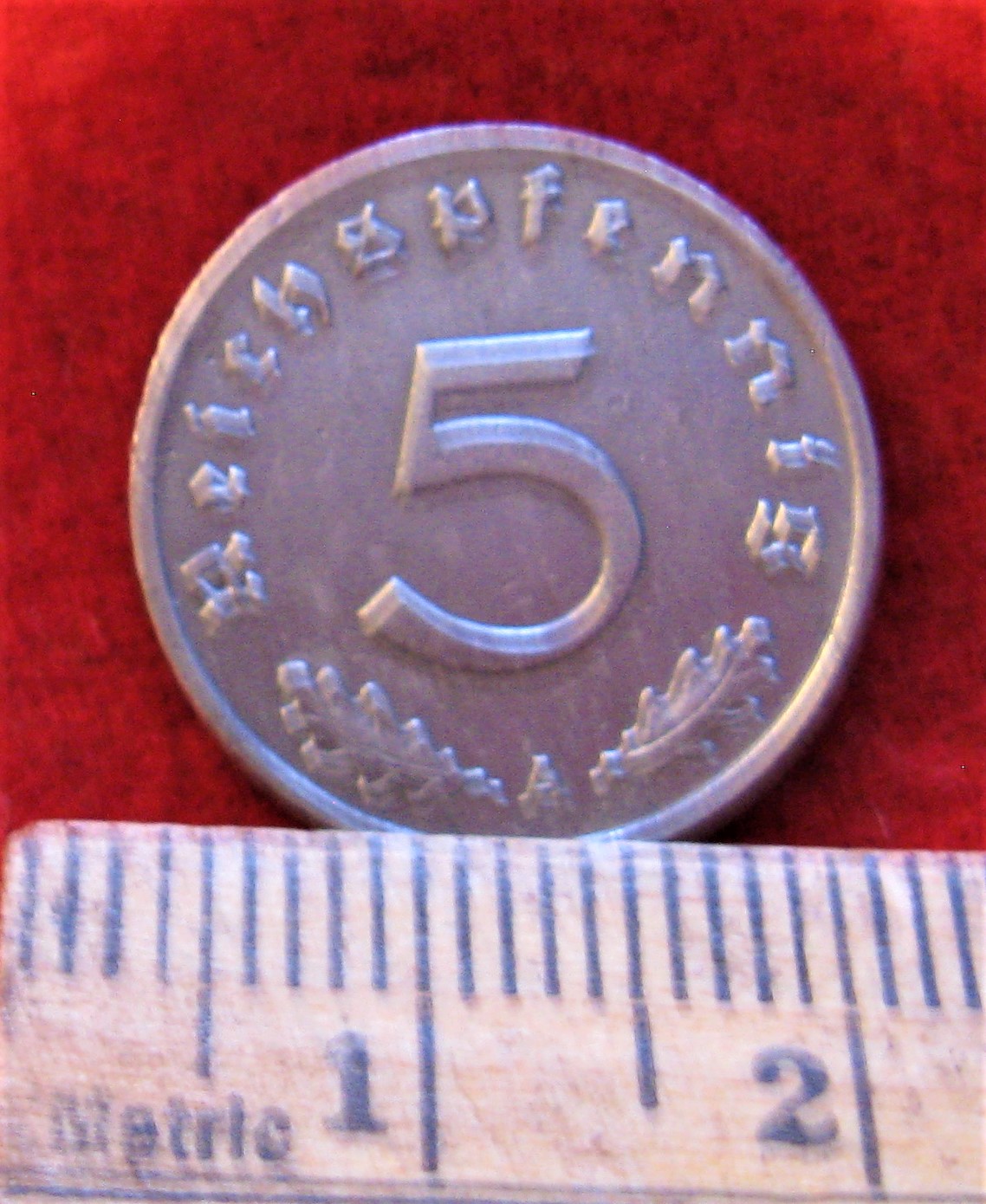 You are viewing a WWII era German 5 phenning coin, made of (tombac or white metal). View scans for dates. These are generally in excellent condition (VF an F ). We presently have 4 pieces in stock presently.