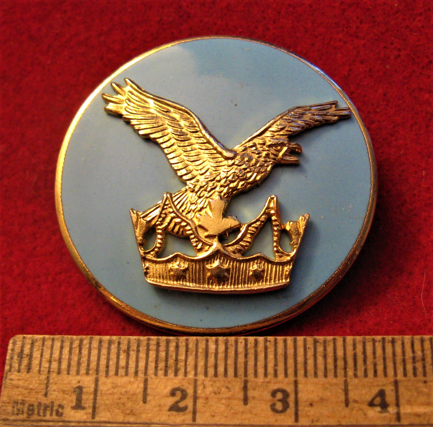 This is a excellent example of a post 1968 uniform badge. Made of brass with perfect enameling. Has a gold plated border and is Hallmarked "Breadner Canada". The motif is a little uncommon with an Eagle over a non-Commonwealth style crown with three stars. May be Air force related due to the design appearance.. Don't know much about it though???