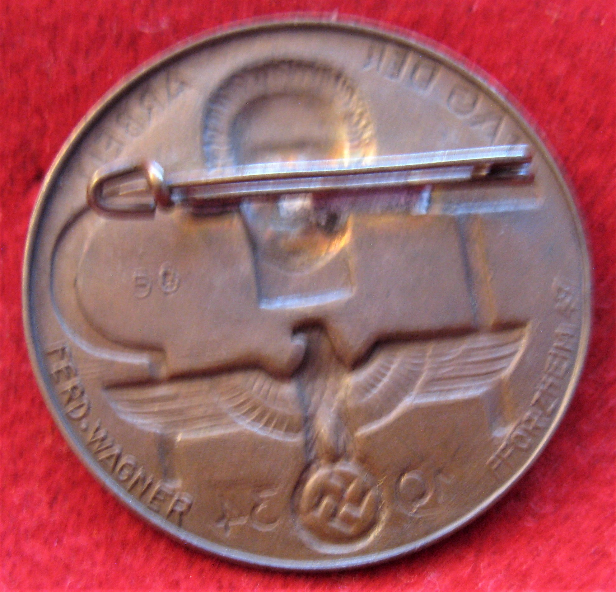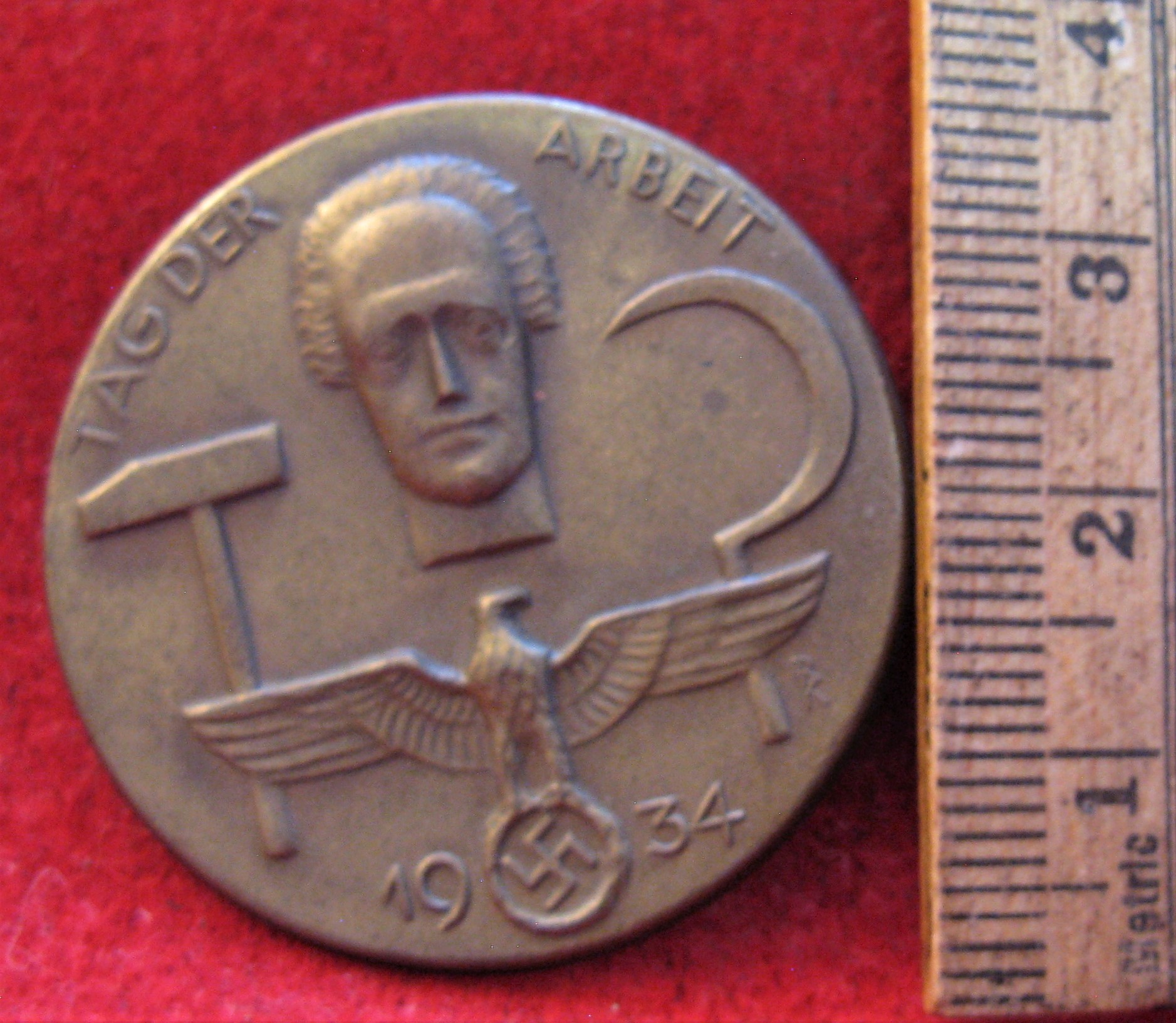 You are viewing a German WW2 "Tinnie" 1934 dated commemorating the Labor Day or the "day of the worker". This large, nicely stamped badge, is made of brass (unusual for "Tinnie" style badges). Safety pin style backing is original and intact.