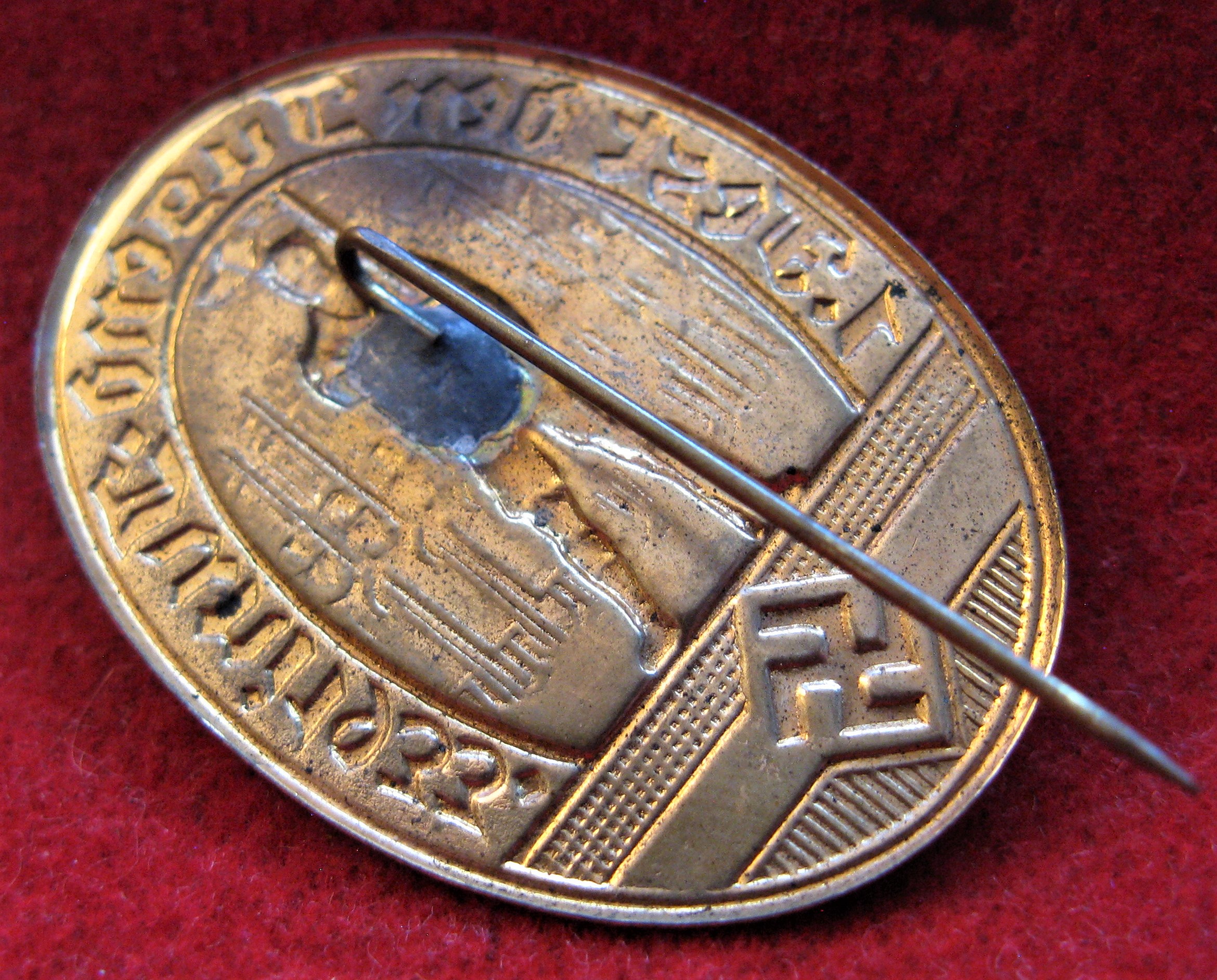 You are viewing a German pre WW2 "Tinnie" 1933 dated apparently commemorating a worker event. This oval, nicely stamped badge, is made of shiny brass (unusual for "Tinnie" style badges). Straight pin style backing is in good order.