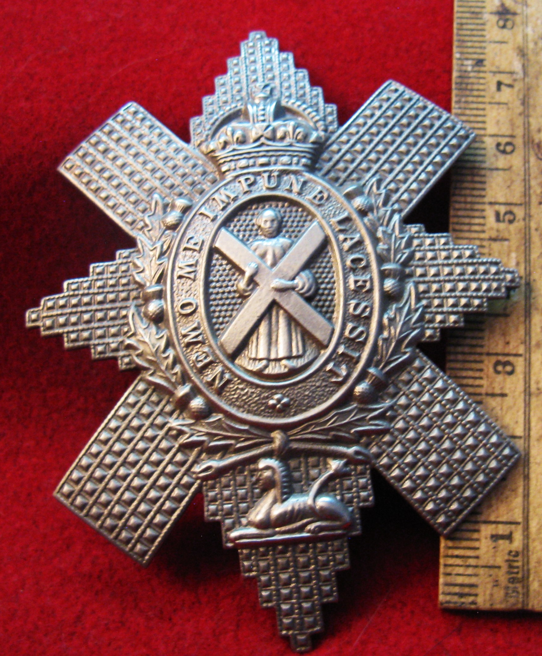 Above are the scans for a WWII era British Army buzbee cap badge. This fine clean example still has its two original lug type attachments, in good order. A rather large badge, made of heavy age-grayed metal. No "Black Watch" on this one but it contains a small sphinx symbol at the bottom. Maybe you know the regiment. Tell us!