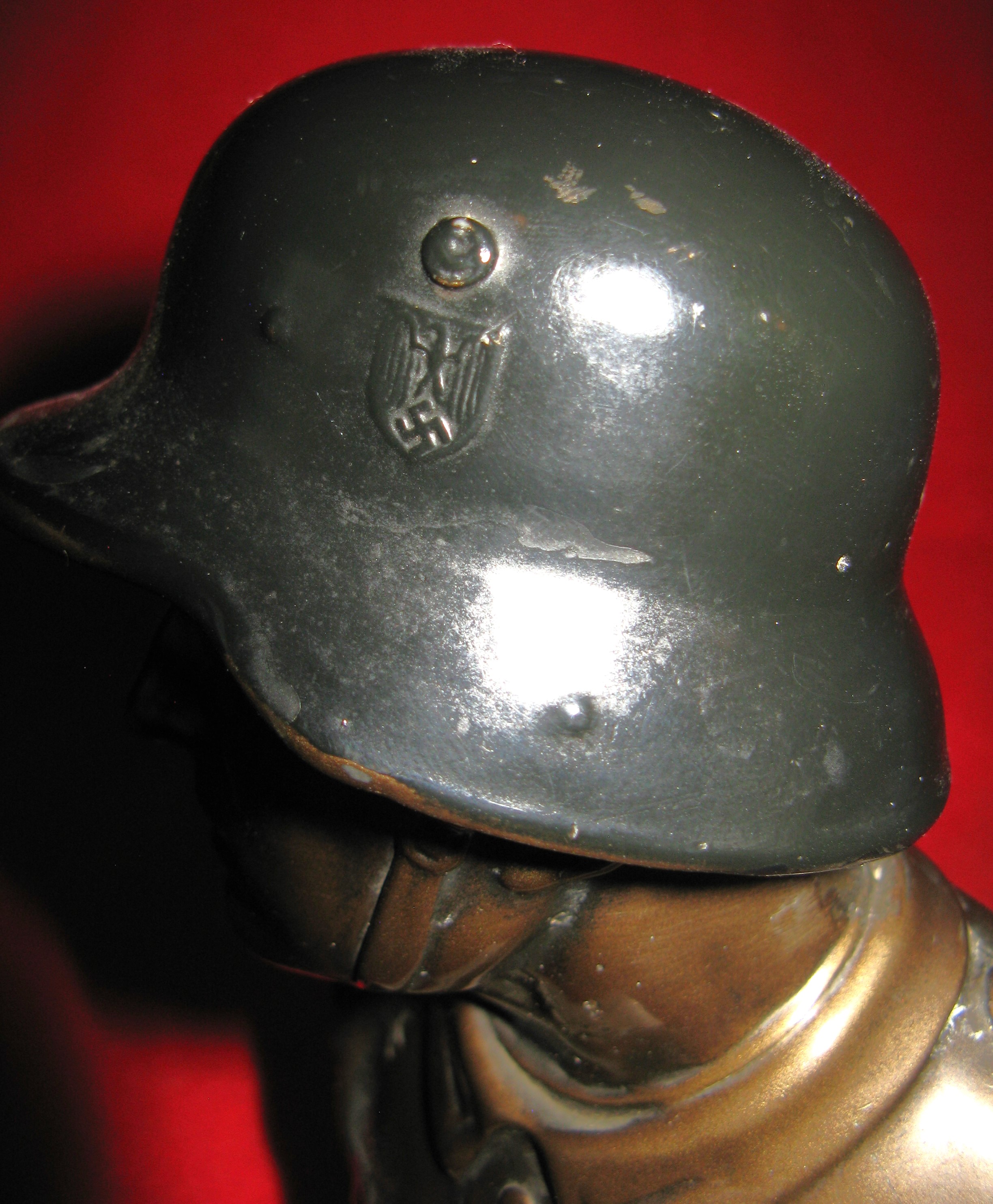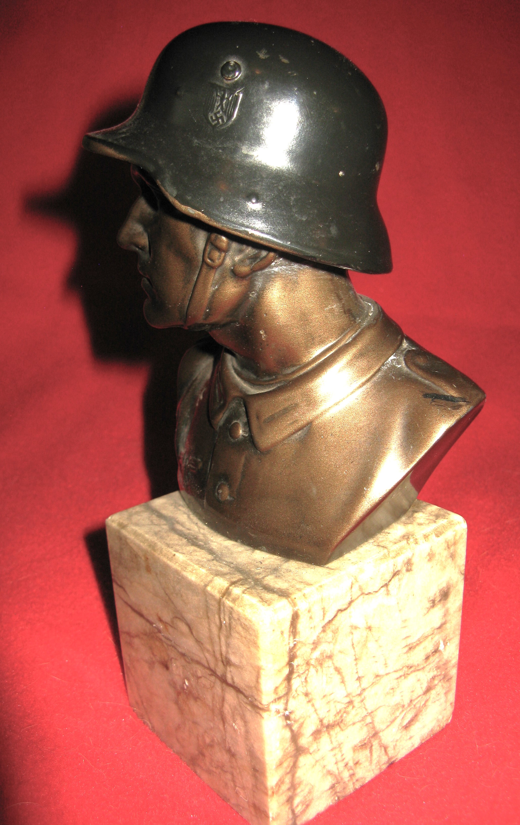Above are the scans for this vintage WWII era two colored bronze heroic bust desk ornament. Quite unusual to find this two colored bronze. It is still in good solid condition showing the head and shoulders of of a helmeted German soldier. The figure is a uniformed stern looking SS soldier wearing an M-42 styled helmet with a relief eagle/swastika and a small National colors crest. There is an SS type eagle on the uniform. The finish on the bust shows some very minor ware on the helmet and chest area of the uniform. It stands nearly 40cm ( 8 inches ) tall and mounted on a 7cm by 7cm by 7cm marble base, nicely felted. A rare artifact from a bygone era.