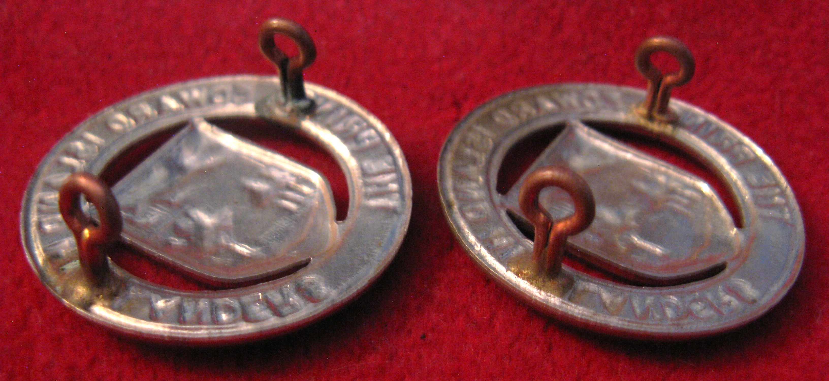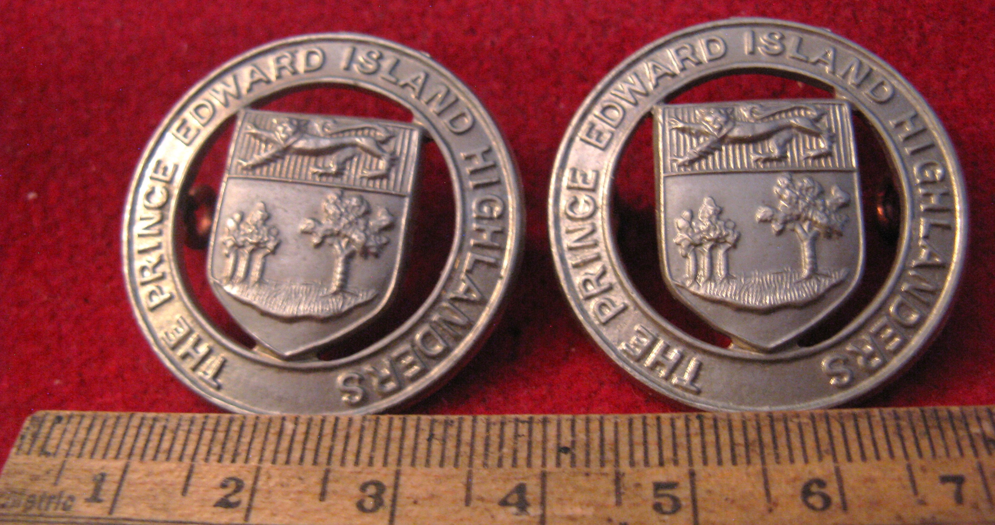 You are viewing an excellent specimen set of two, for the WW2 Kings Crown Prince Edward Island Regiment of Canada collar badges. All lugs intact on these fine white metal badges . A large size for a collar badge, with collar size about 3 cm in diameter.