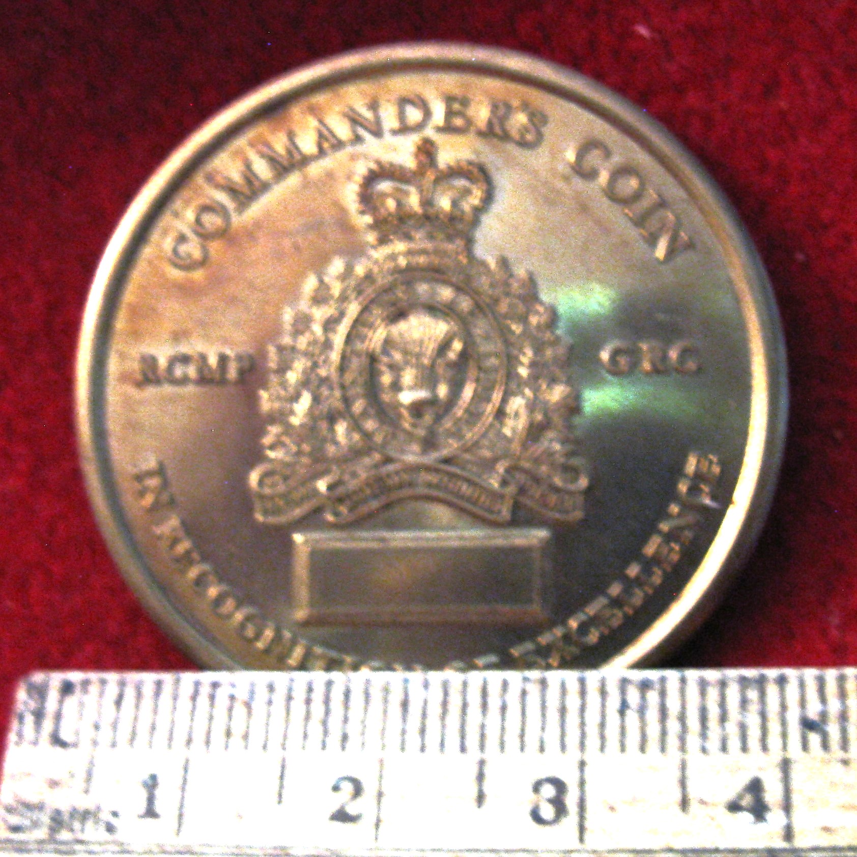 Above are the scans of this large brass Mounted Police challenge coin. Still in perfect condition with no scratches or wear marks, just the mere beginnings of age patina. Has a small sized emblem on the shiny brass face, just below the name "Commanders Coin", the inscription along the bottom reading "In Recognition of Excellence" . The obverse show the flag and lettering of "K Division, and is dated 2003. View scans for details.