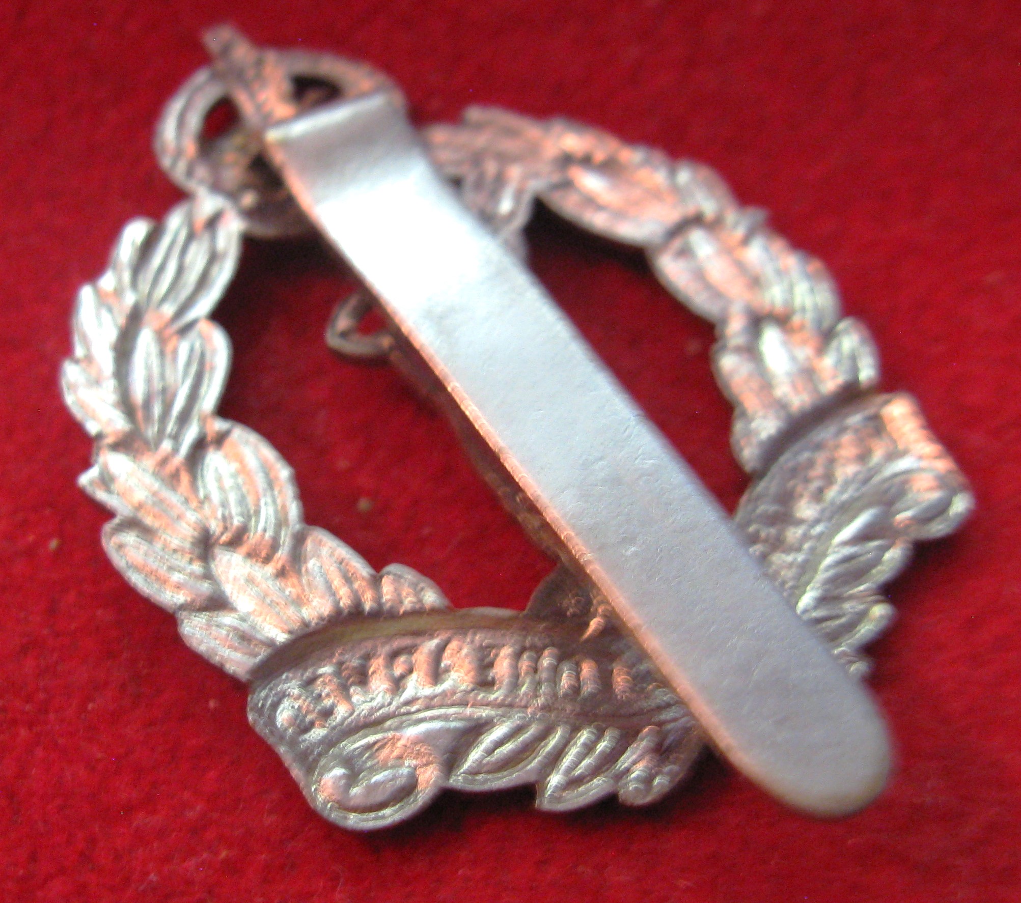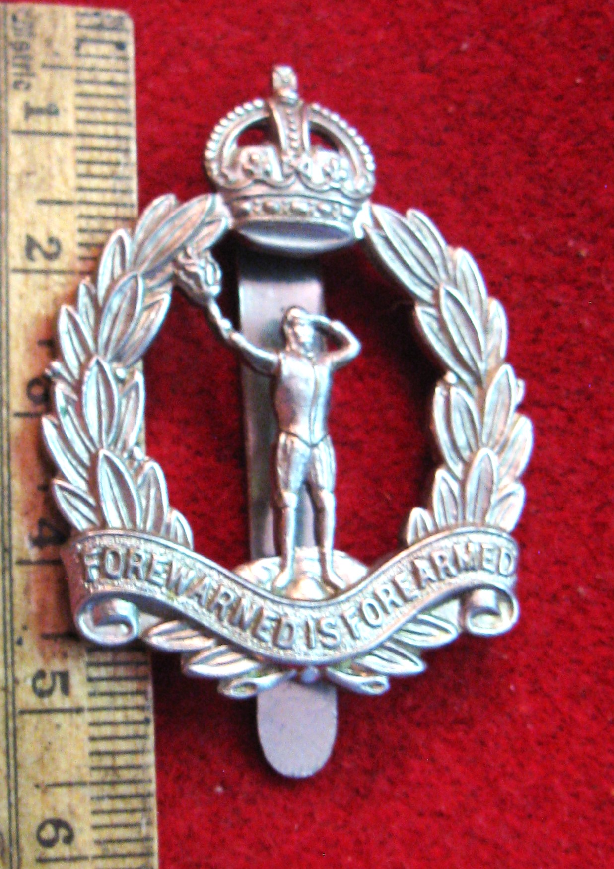 Above are the scans for a vintage WWII era British Intelligence Corps beret badge. The motto on the bottom says "Forwarned is Forearmed". Made of white metal with original welded stem lug type attachments in good order.