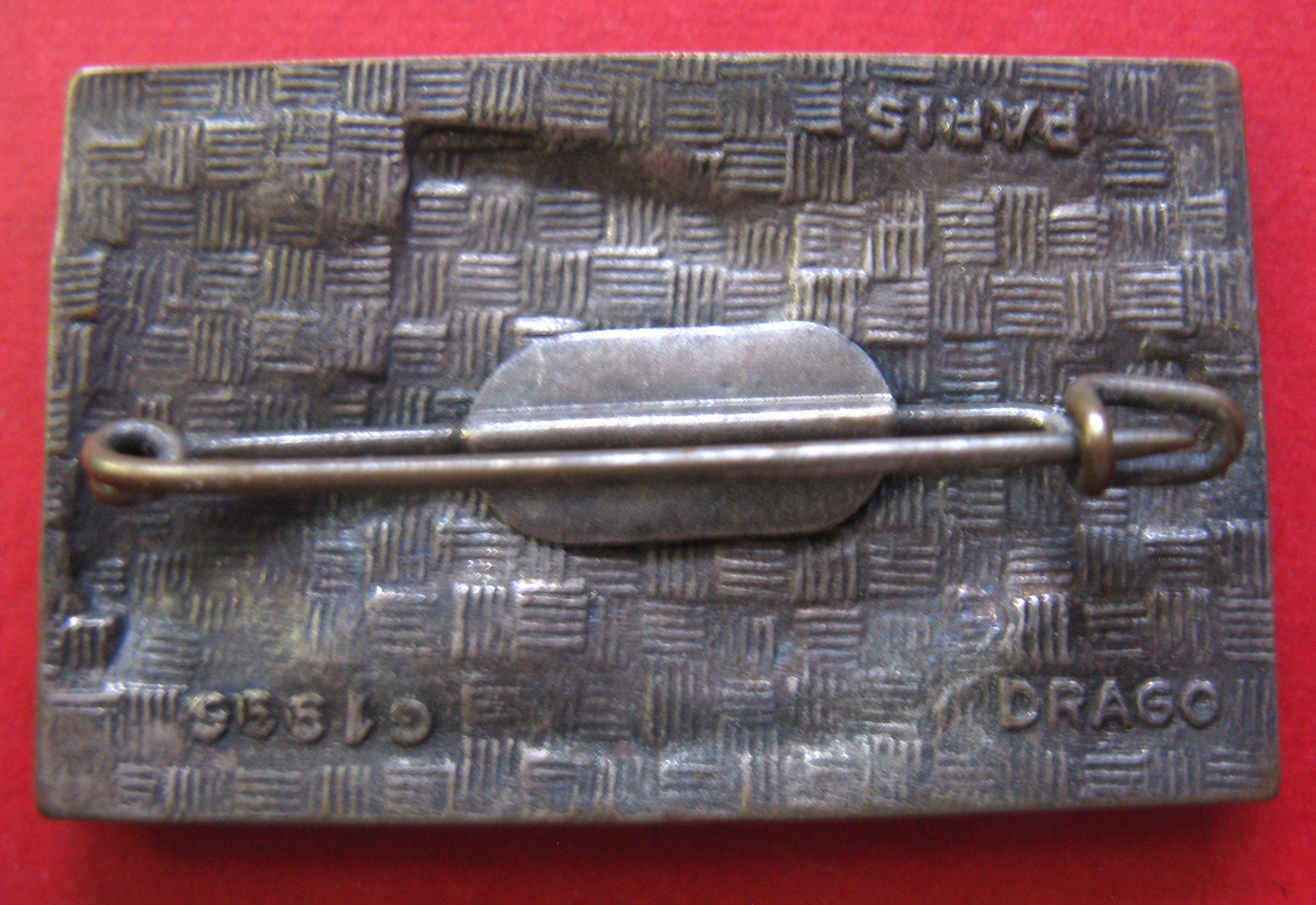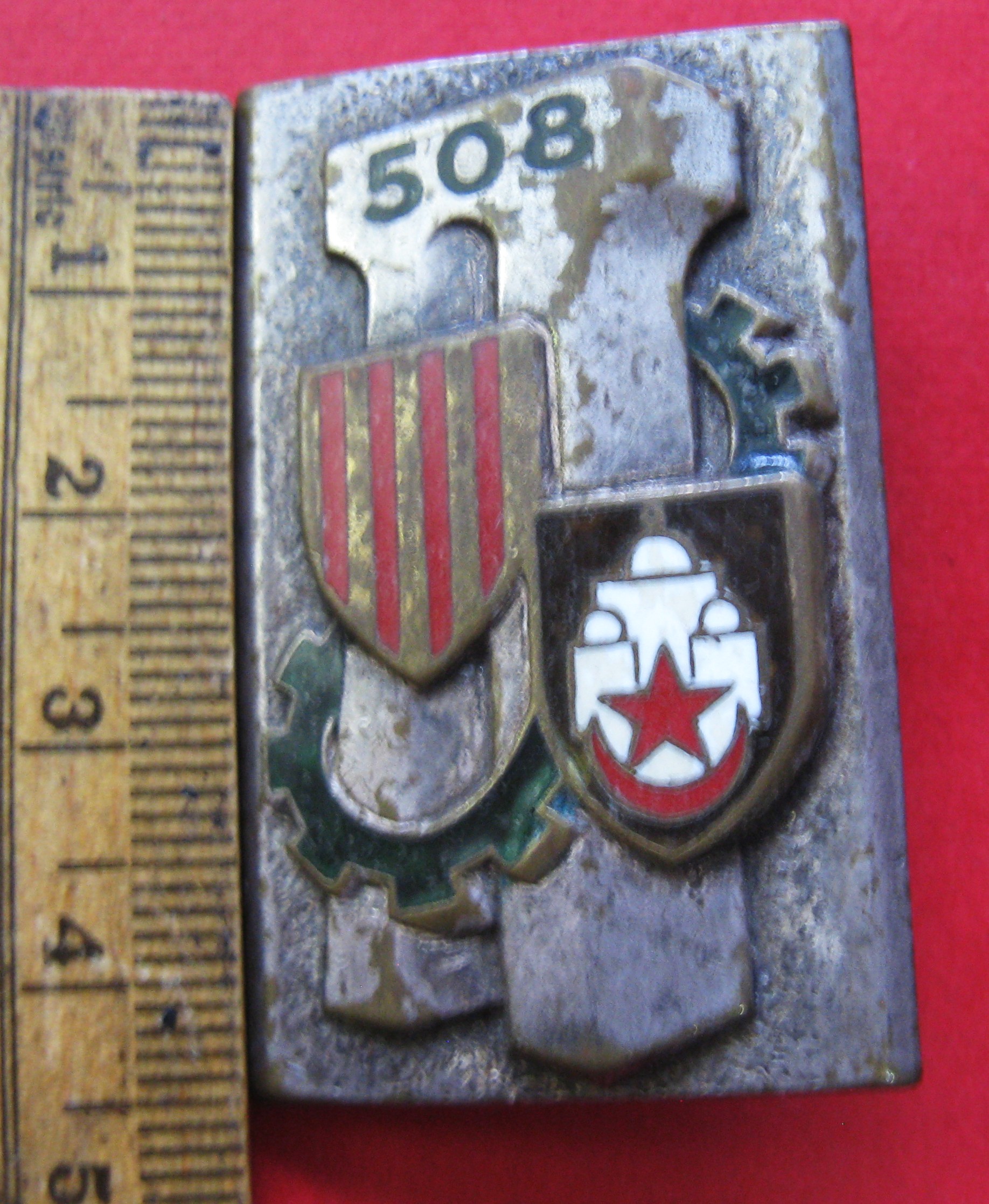 This is an interesting badge related to the engineering section of the French Army. Numbered 508. Made of a heavy white metal. Has two small enameled shields over two enameled cogs . At the top is the number "508". The badge itself has a straight pin style attachment. It is hallmarked "Drago ... Paris", with a number that may be a date and appears to be 1933. Don't know much more about it though???