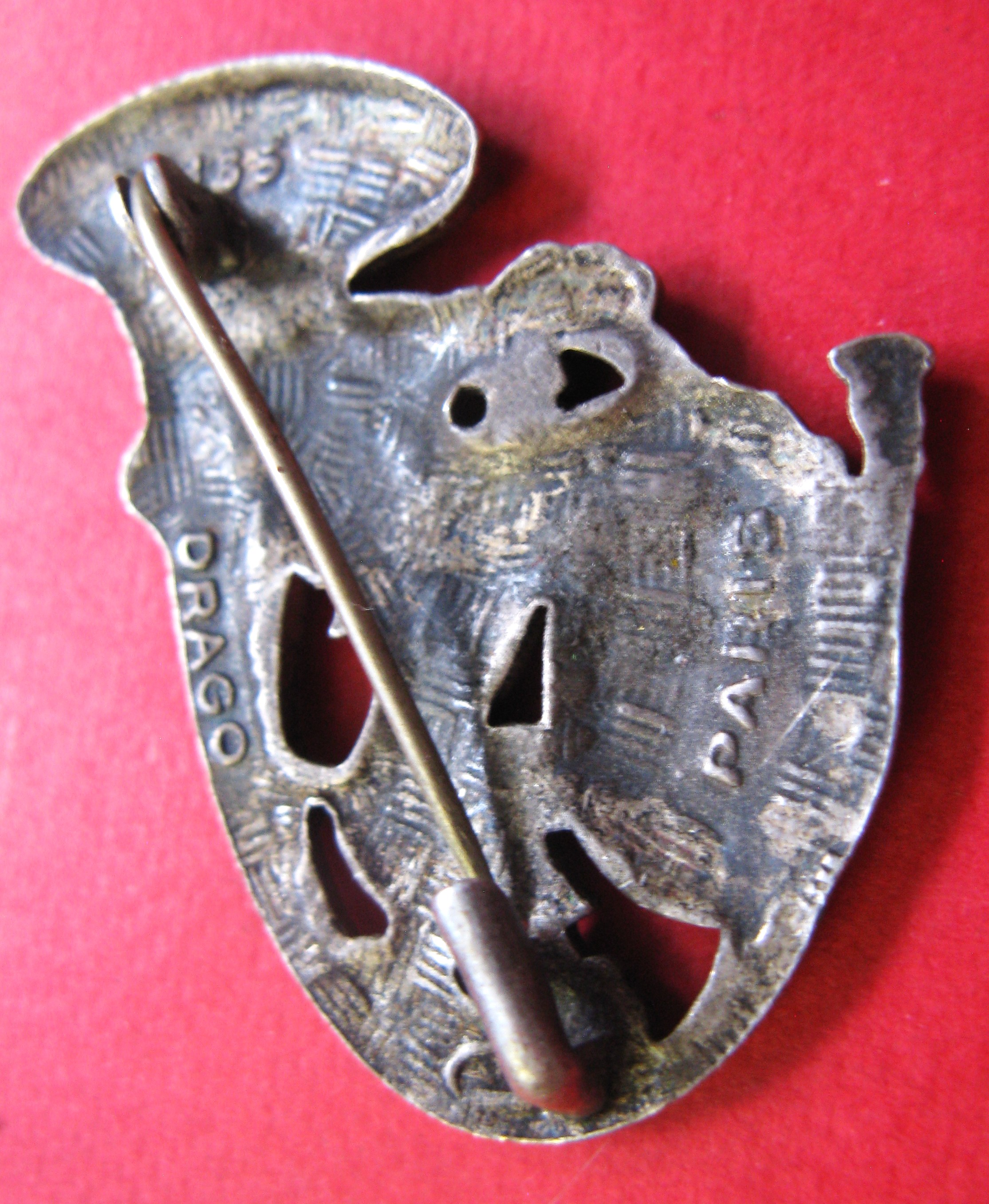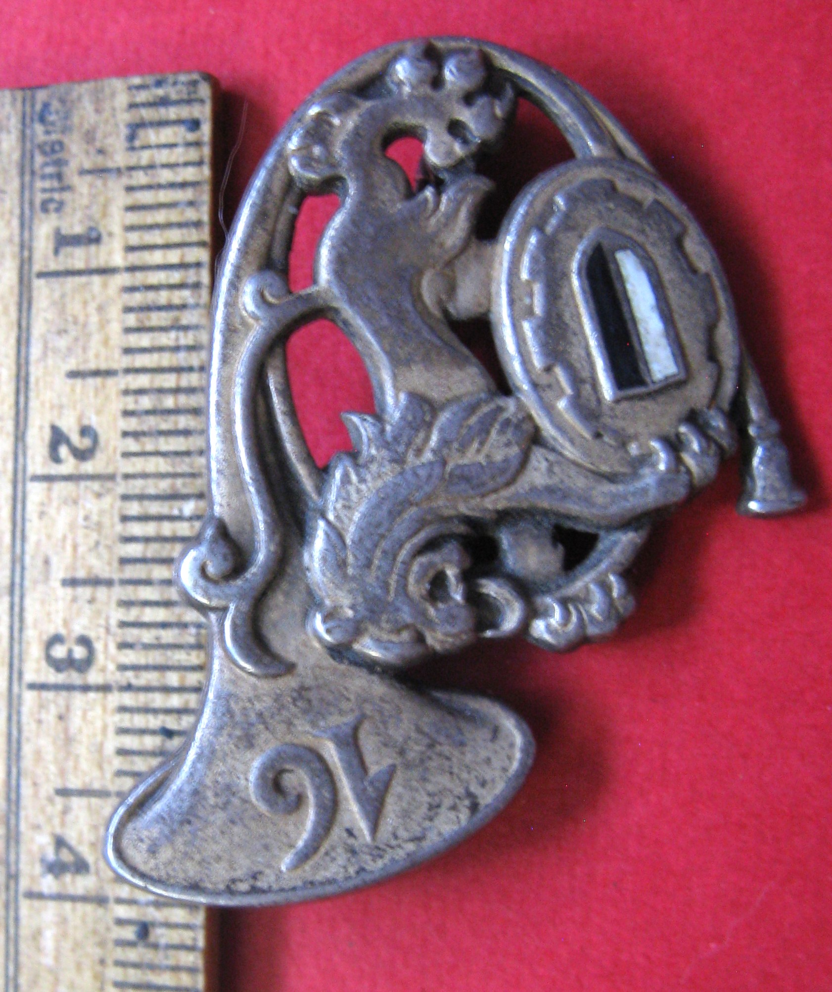 This badge is related to the French Army. Made of a heavy white metal (may be silver). Has the motif of a lion clutching a small shield, standing on a trumpet, or a French horn. The horn bears the number 16. Has no enameling except for a small piece on the sheild held by the lion. The badge itself has a straight pin style attachment. It is hallmarked "Drago ... Paris". Don't know much more about it though???
