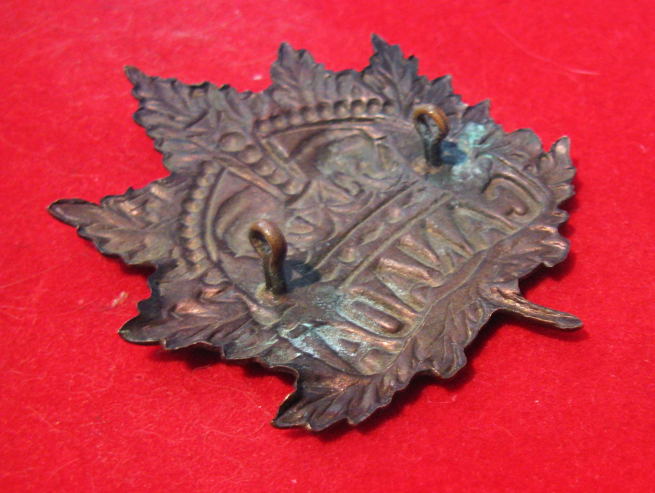 You are viewing a large copper helmet badge (approx 6.5cm long) for the Canadian contingent that served, most likely, in South Africa during the Boer War era.. This badge has a Victoria crown and small lugs. A exquisit relic from the days of a bygone era, with all original lug type fasteners intact and in good order. A rare find among Victoria era cap badges.