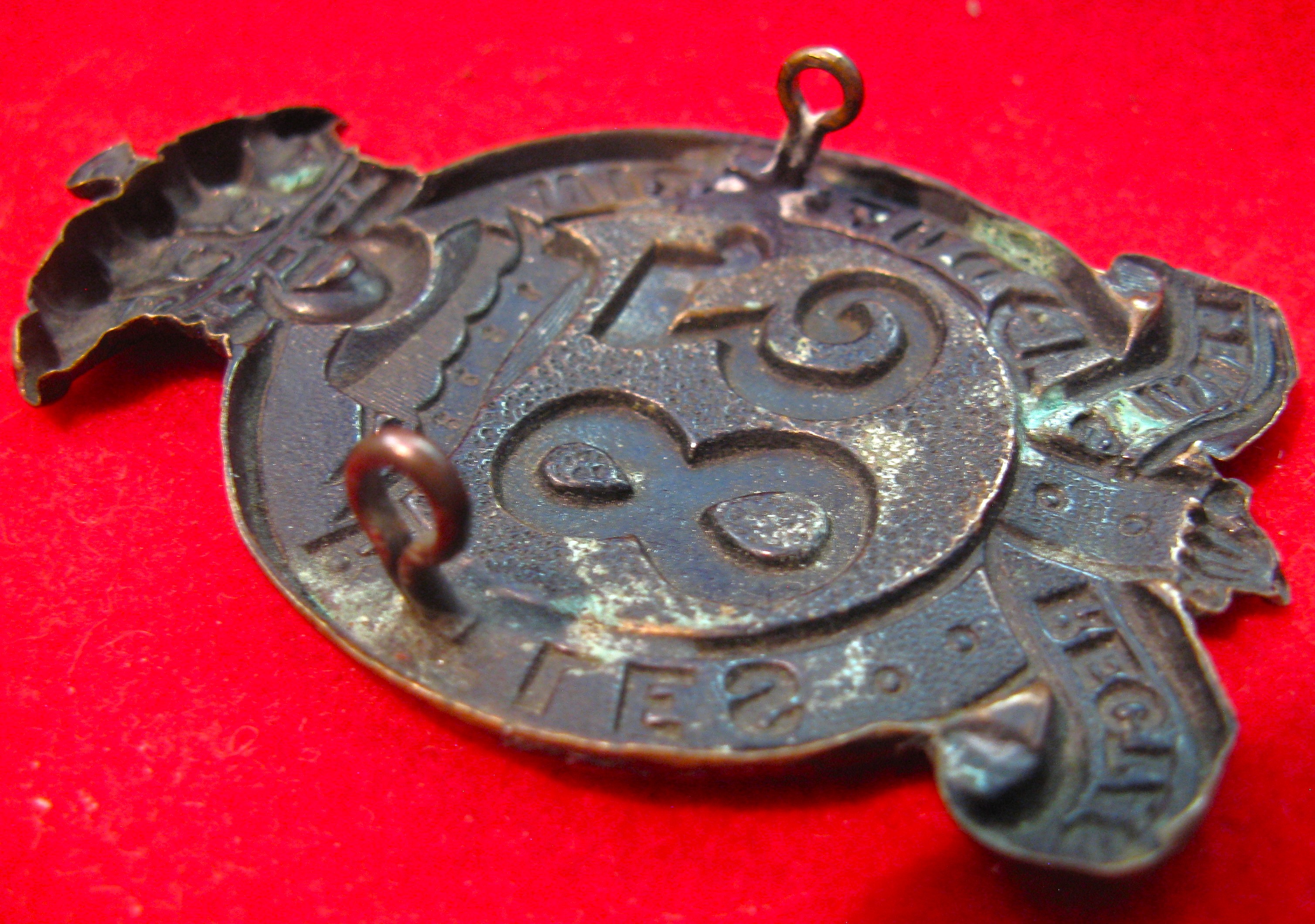 You are viewing an extremely rare pre 1900 era large bonnet badge for the 38th Dufferin Rifles . This design pattern has some Masonic indicators. This large badge is made of browning brass. Both horizontal lugs are original and intact. Established in 1866 to fight the American Fenians.