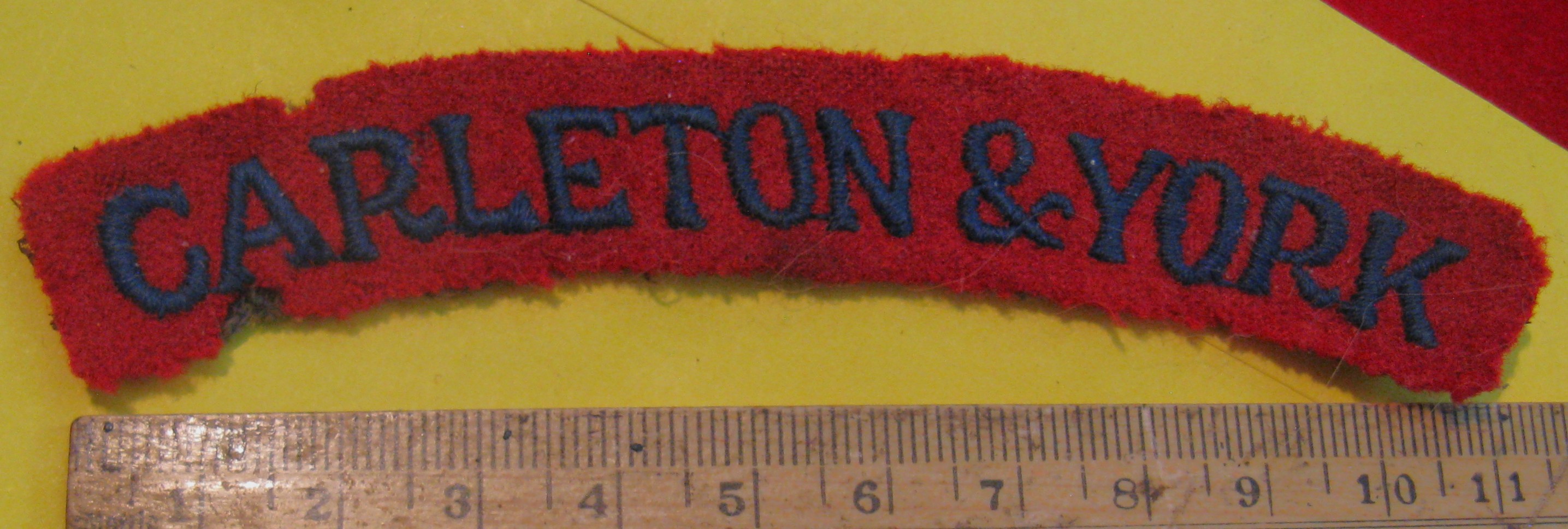 ou are viewing the scans for a WW2 era Carleton & York Regiment shoulder Flash Very good condition, Still intact after all these years. Has a black cheesecloth backng with a royal blue embroidered field used red felt.