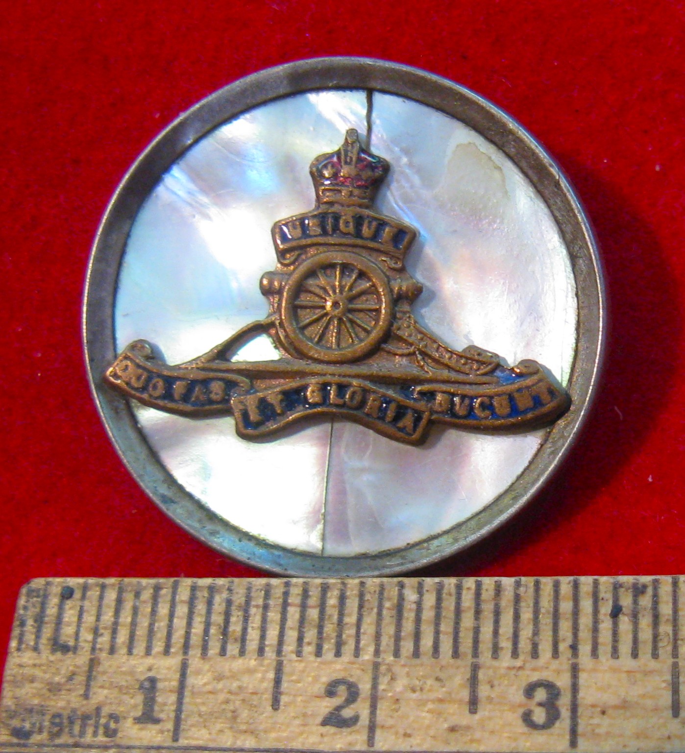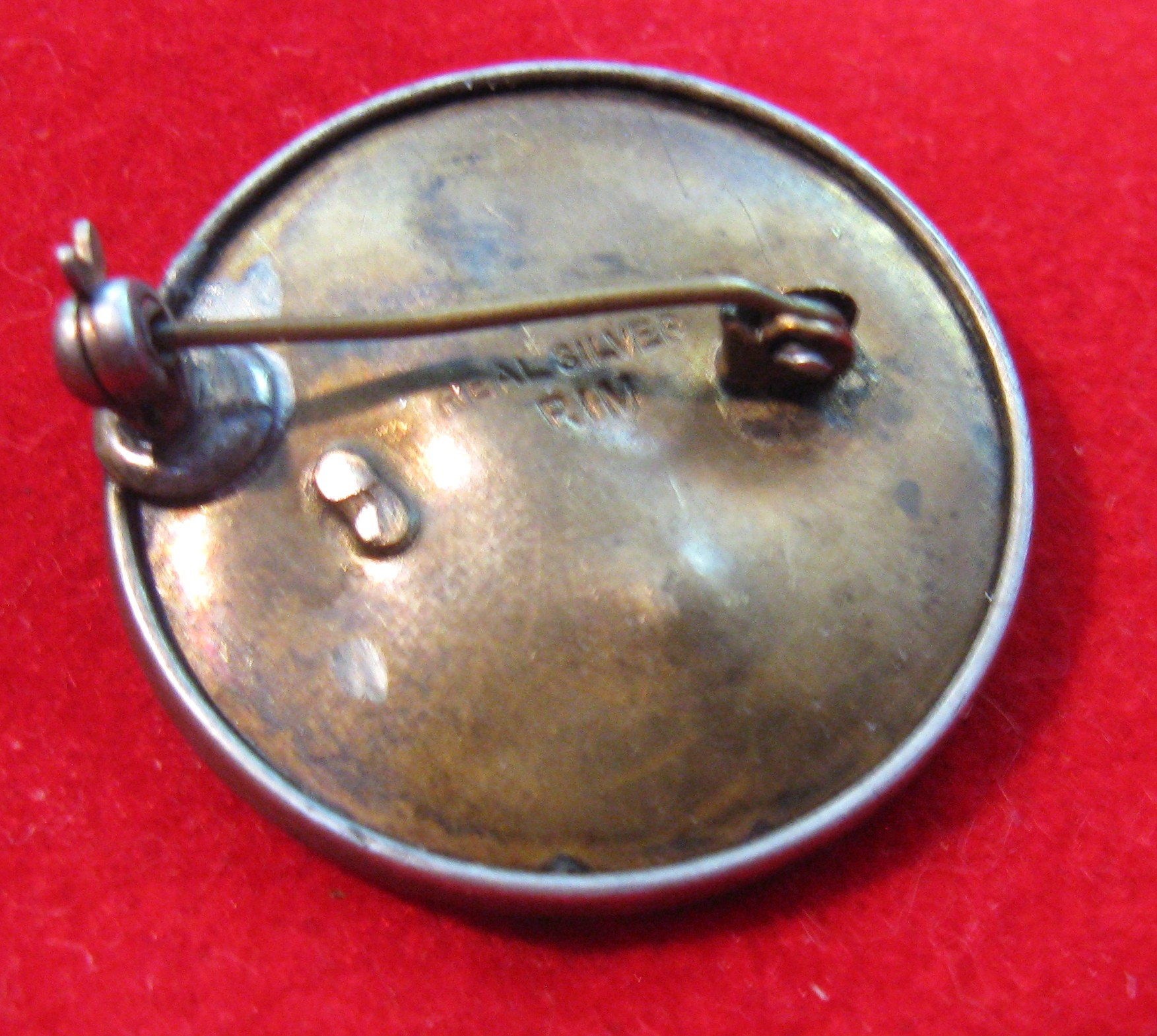 You are viewing a WWII Artillery sweetheart broach with a mother of pearl backing under an enameled brass artillery insignia. The broach is ringed with silver and the backing ia brass, and marked "ringed with silver". It still has its original straight pin attachment intact and in good order.