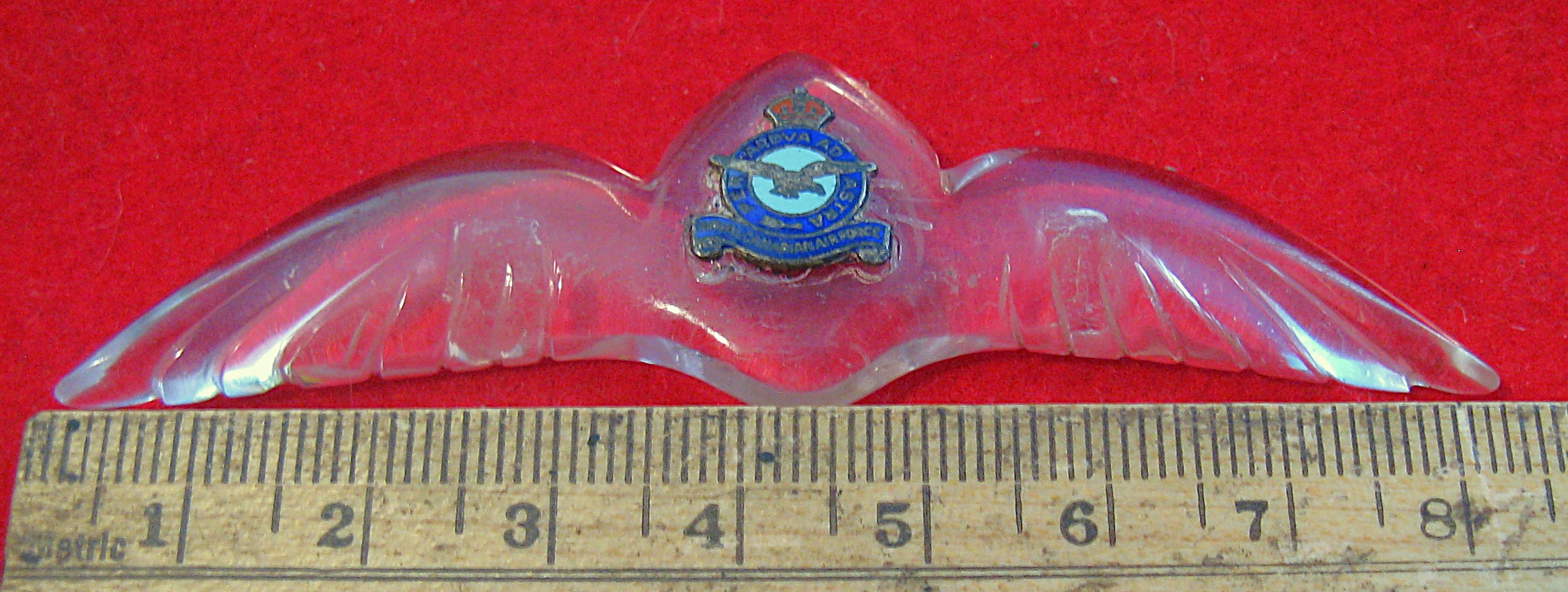 You are viewing a WWII era sweetheart pin. It is made of clear celluloid material, in the shape of the WWII unifrom cloth badge used on the uniforms. It has a small RCAF insignia inserted into the celuloid material. Some have concluded that these pendants were made from the material used for the cockpits of the WWII aircraft. The really unique feature of this sweetheart pendant is its wing shape. This item is still in excellent condition for its age, except the attachment device is missing. View scans for details.