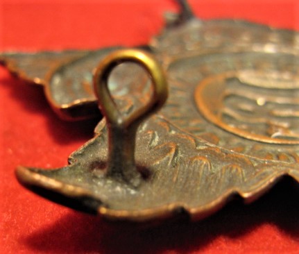 Above you can see the scans for this relatively rare, large, and beautiful WWI 185th Battalion cap badge. A darkened copper o/r badge with very nice patina giving evidence to its age. This beautiful example is complete with both original lugs in good order.
