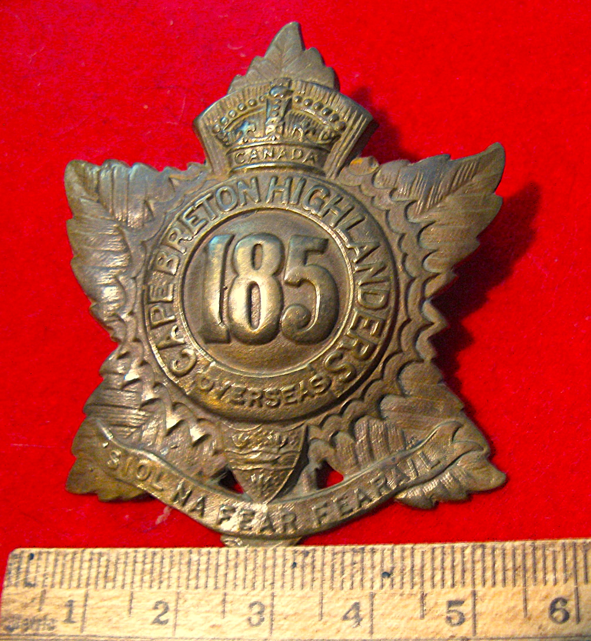 Formed in 1916. This battalion was raised in Cape Breton, Nova Scotia, with headquarters in Sydney. Known as the "Cape Breton Highlanders". Sailed for England in August of 1916. A beauty for any collector of Canadian CEF badges.