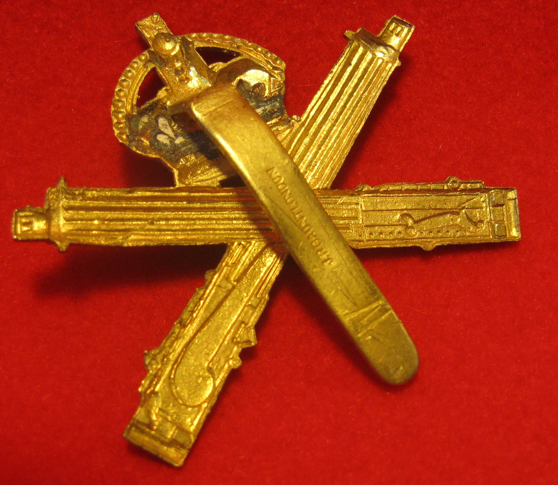 Here is a nice clean WW2 (KC era) Machine Gun Corps Badge. It has its tang attachment in good condition. It appears to be made by a stamping method but with excellent detail on the design features. Not sure if it is British or Canadian in origin, but still a very clean browning brass badge. Hallmarked "J.R. Gaunt London"