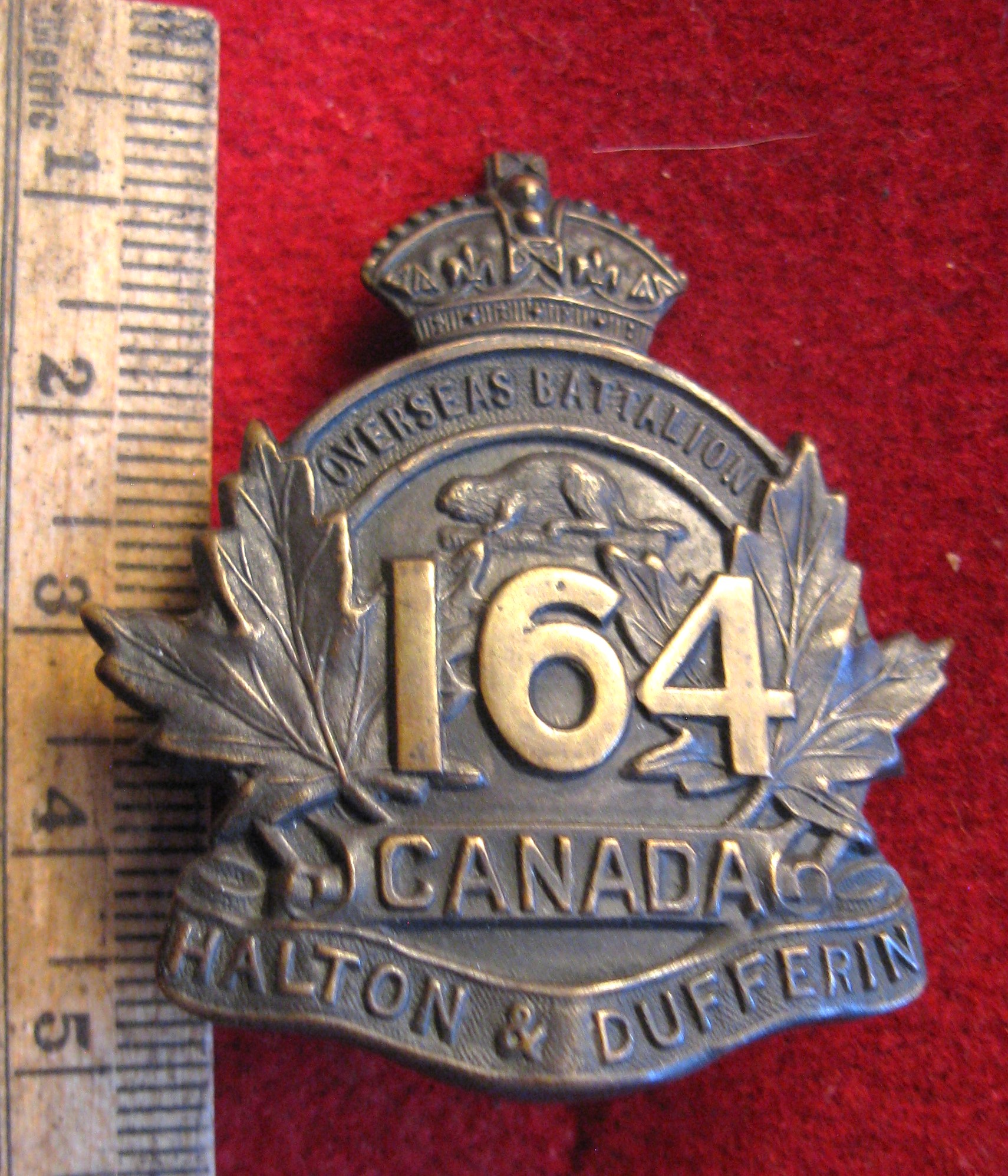 Above are the scans for this 164th Battalion cap badge. Complete with both original style lugs. An o/r browning brass badge with very nice patina giving evidence to its age. A beauty for any collector of Canadian CEF badges.