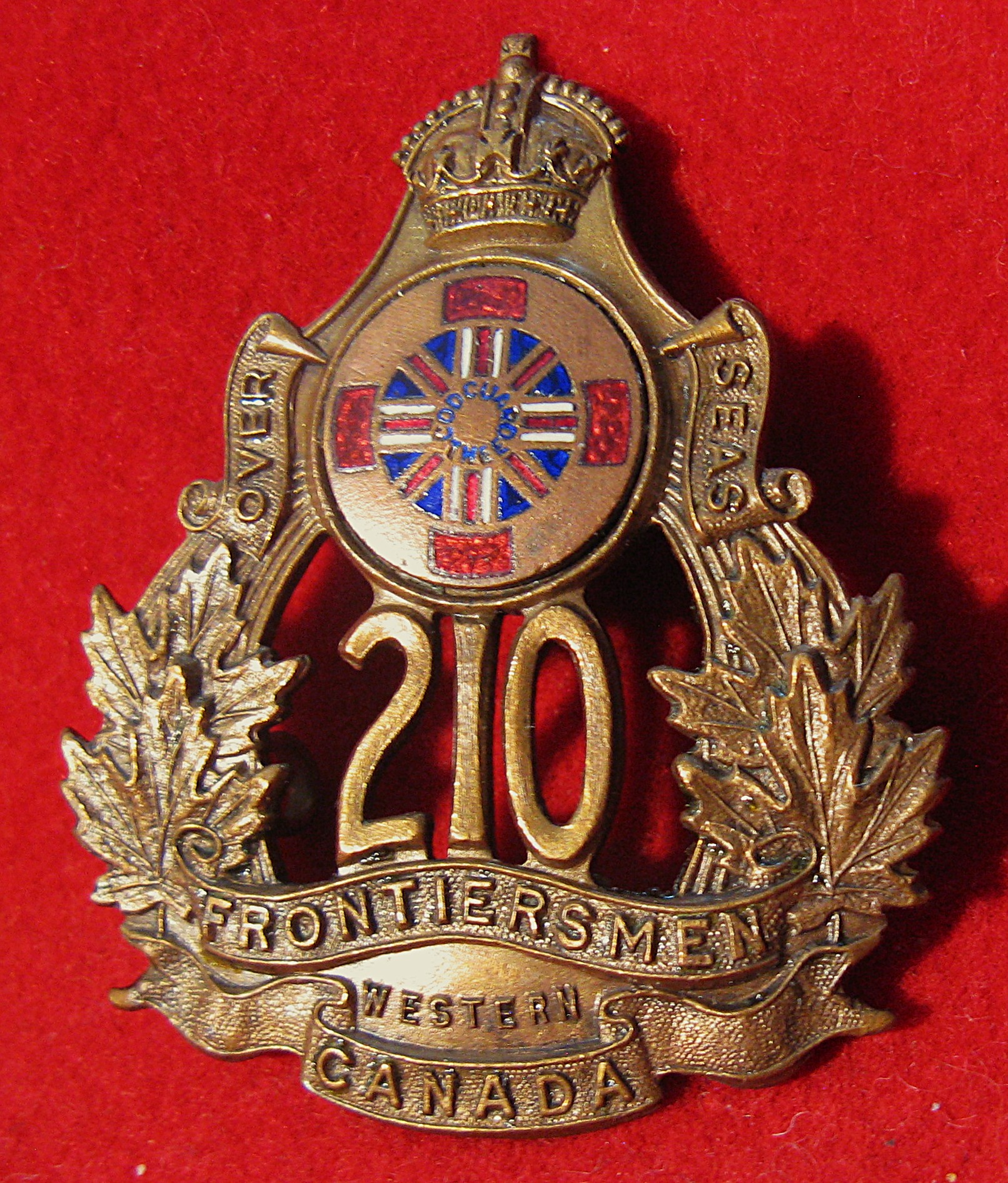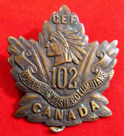 A rather large badge, with a Victoria style crown over top. $259.00 | ![]() CEF WWI 102nd Battalion Cap badge
