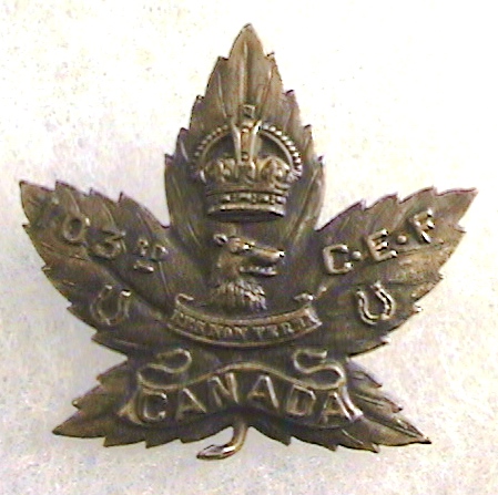 shows in the scrolling across the center, its home regiment name "Winnipeg Light Infantry". $149.00 | ![]() CEF WWI 103rd Battalion Cap badge