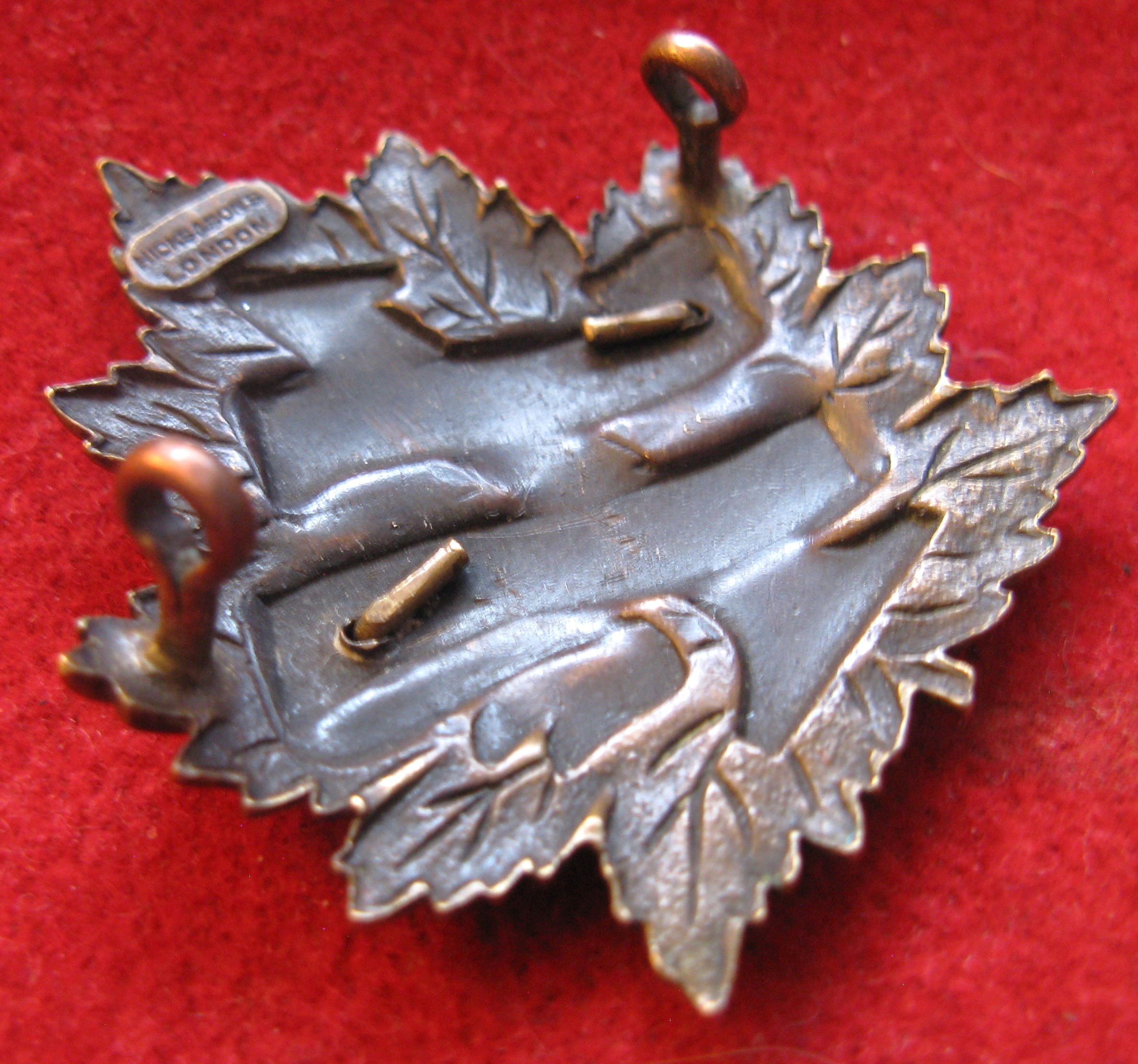 This one has both its original lug type back fasteners, complete and in good order. In excellent overall condition. A bi-metal overlay construction on browning brass. A clean badge with very nice patina giving evidence to its age. A rare beauty for any collector of Canadian CEF badges.