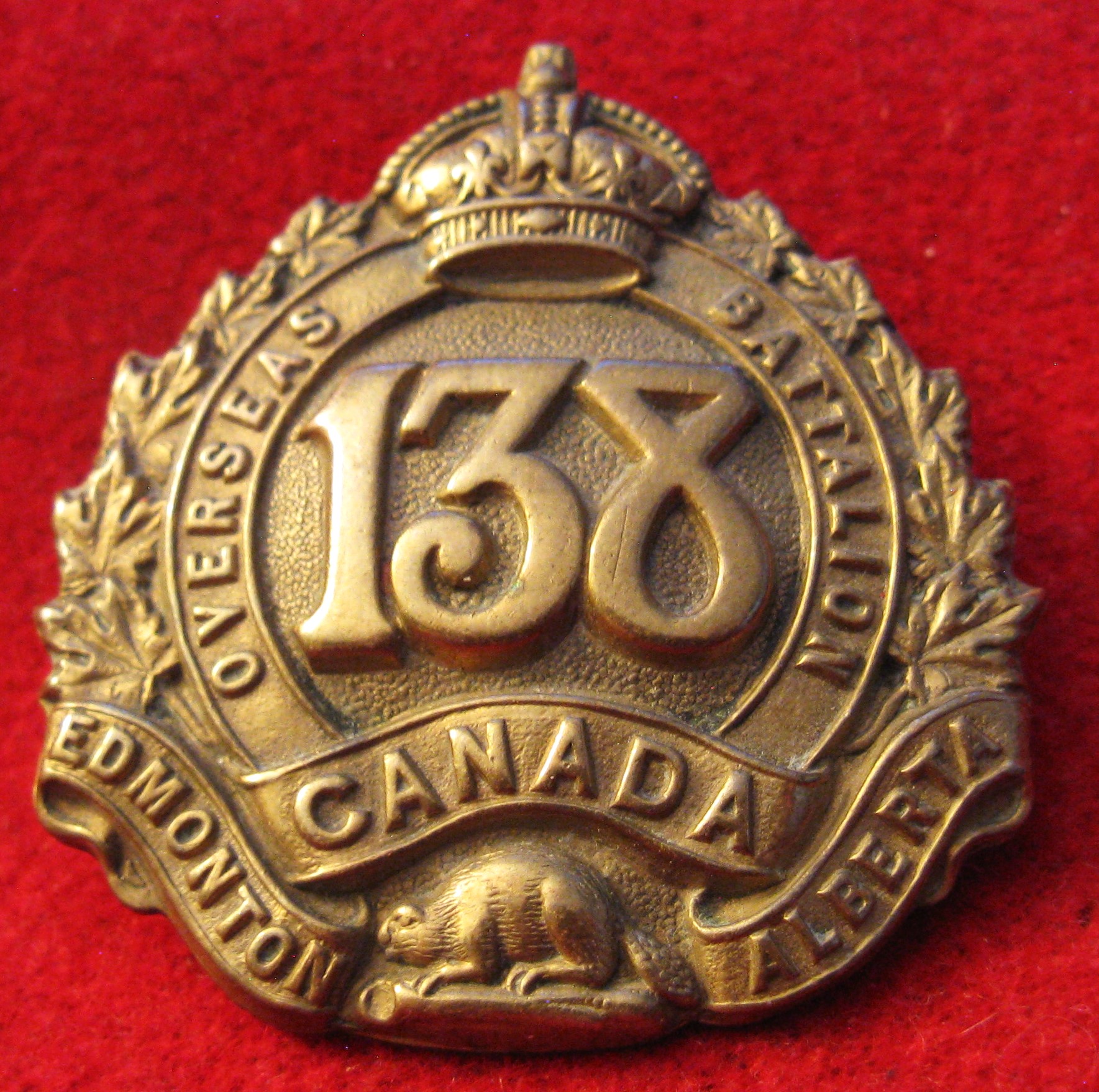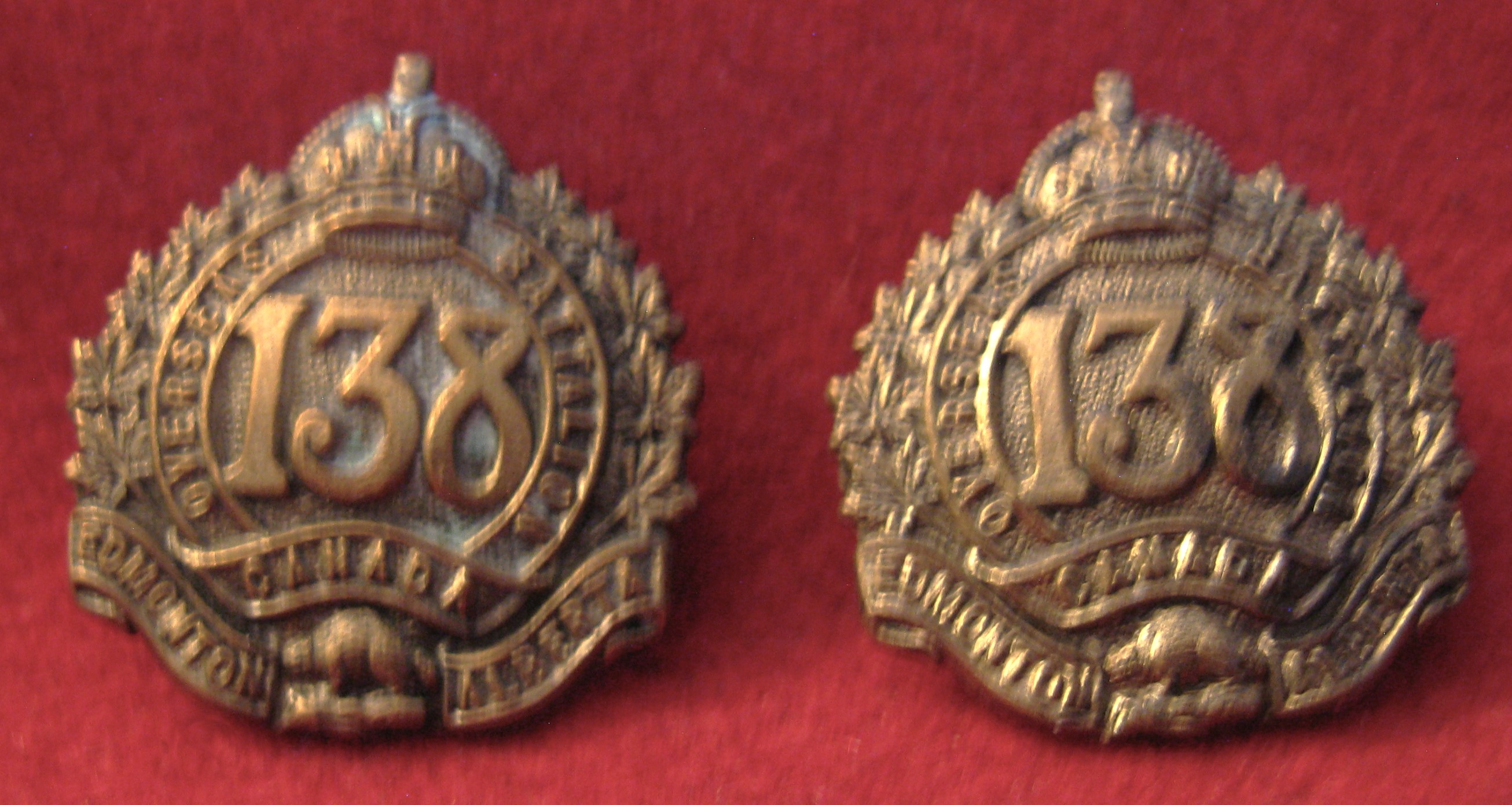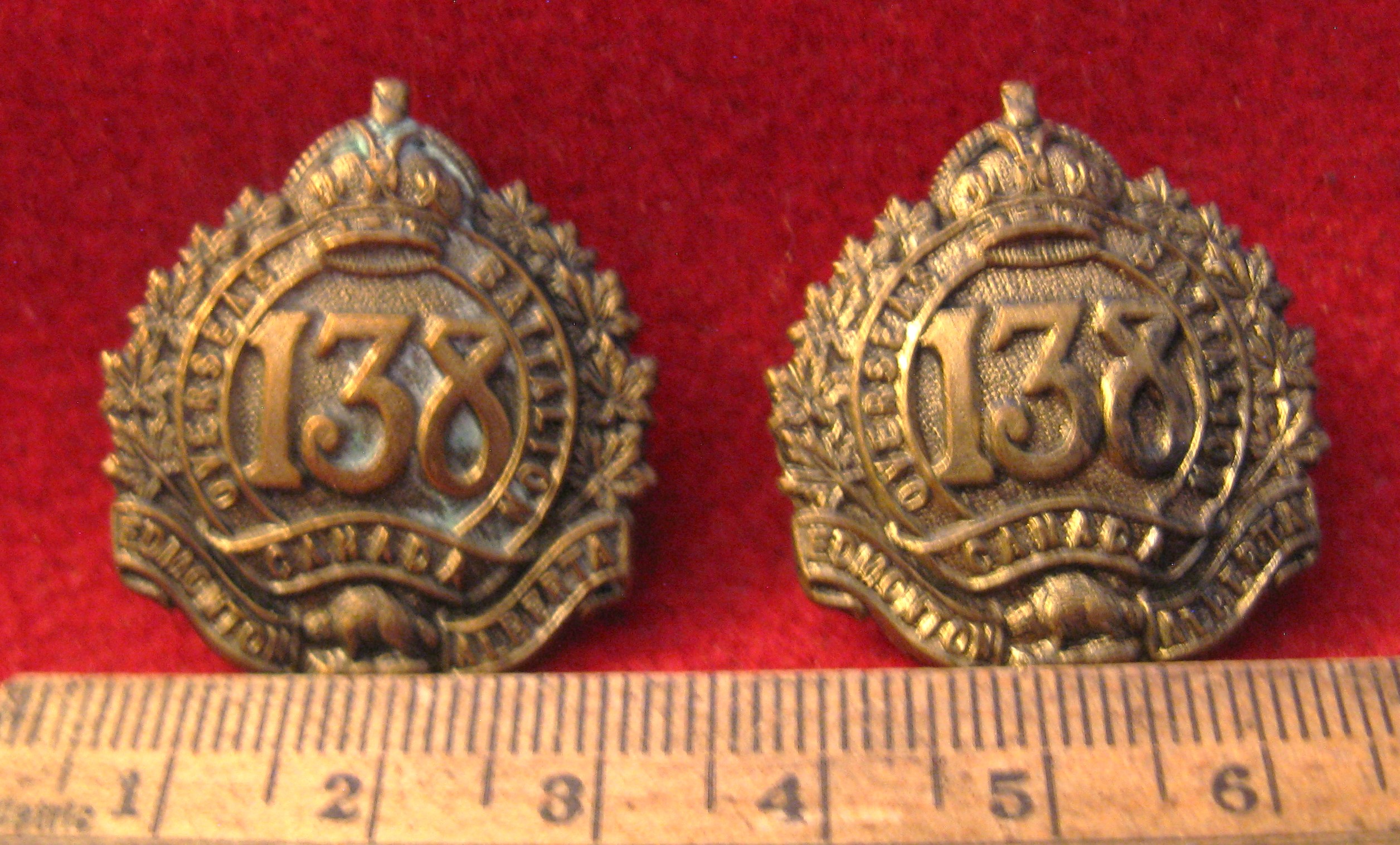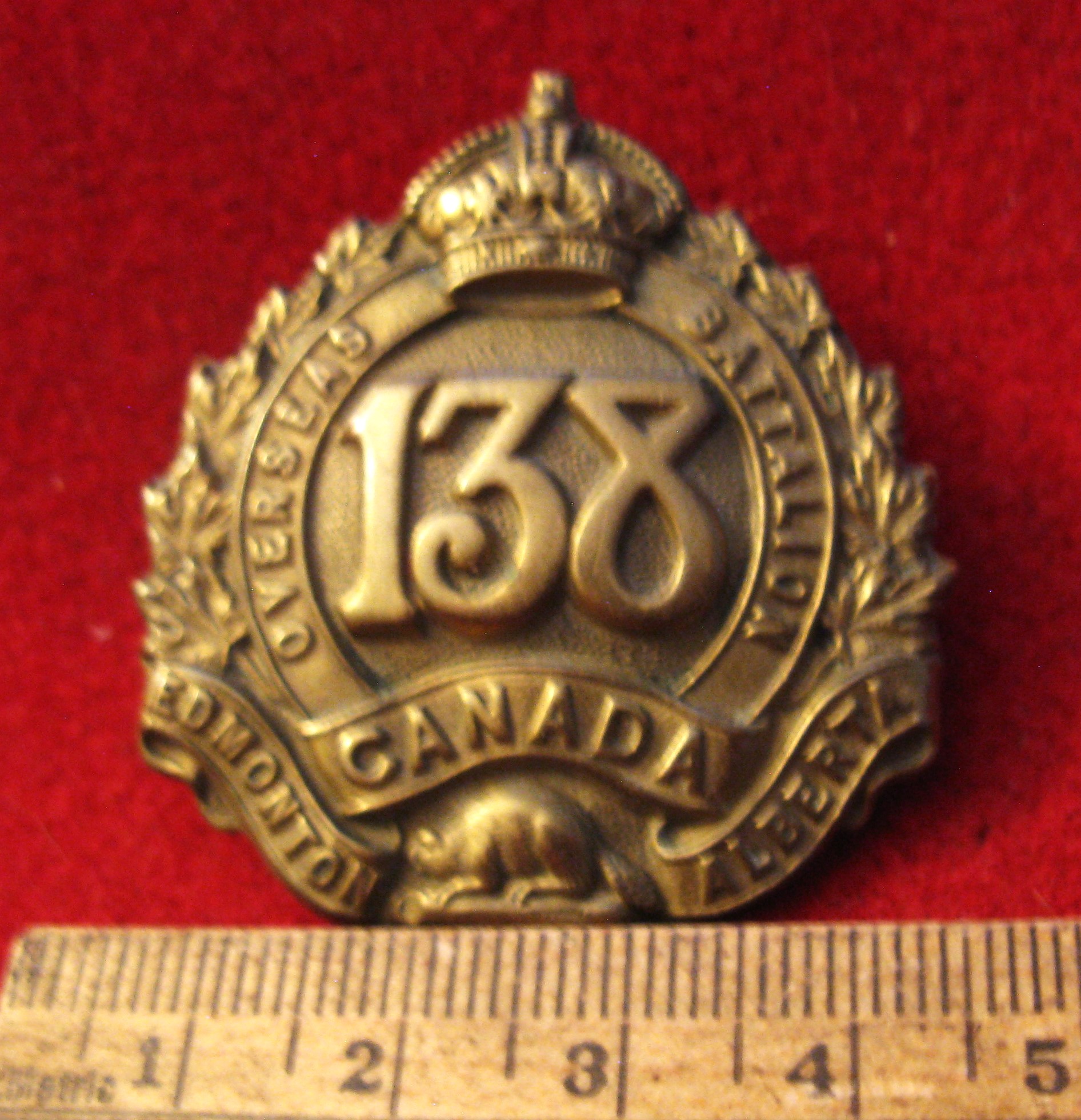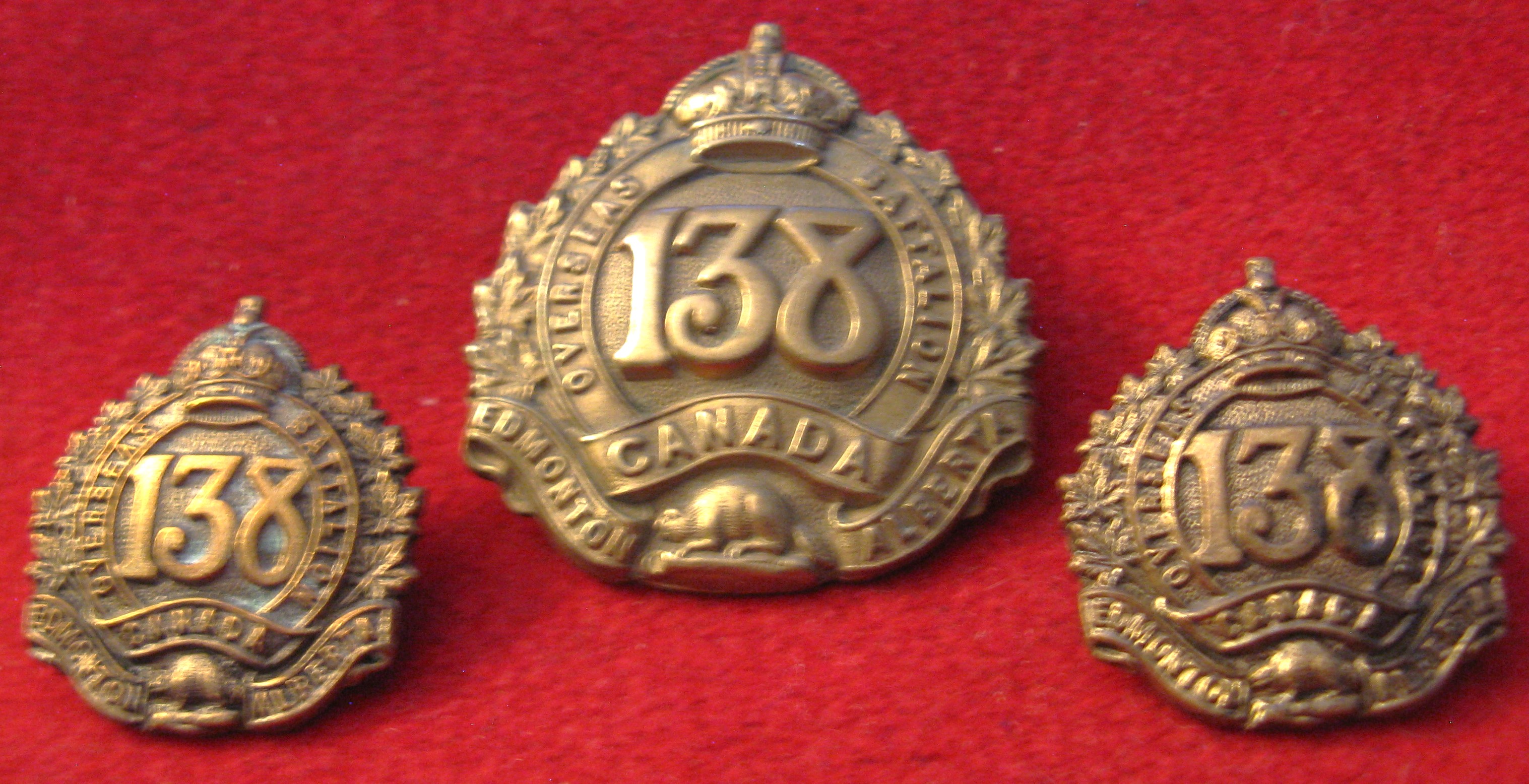 You are viewing a vintage 138th CEF Battalion WWI cap and collar badge set of 3. All lugs are original and in good order, and on the cap badge they are of the harder to find flat type of the early WWI era. Excellent overall condition on clean brass. very nice patina giving evidence to its age. Nicely hallmarked "Jackson Bros".