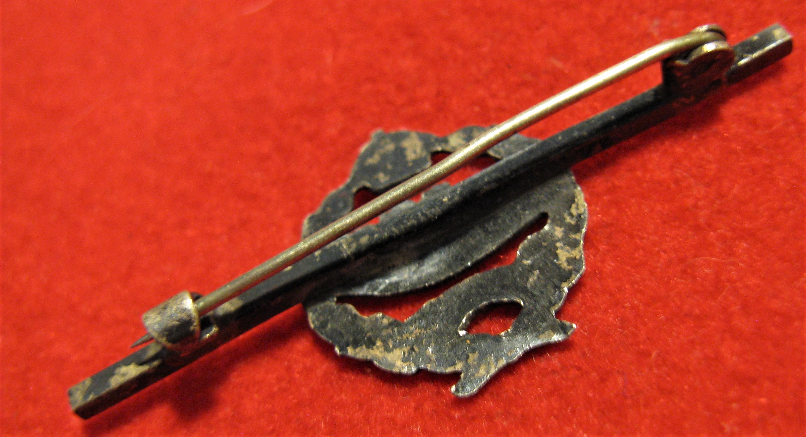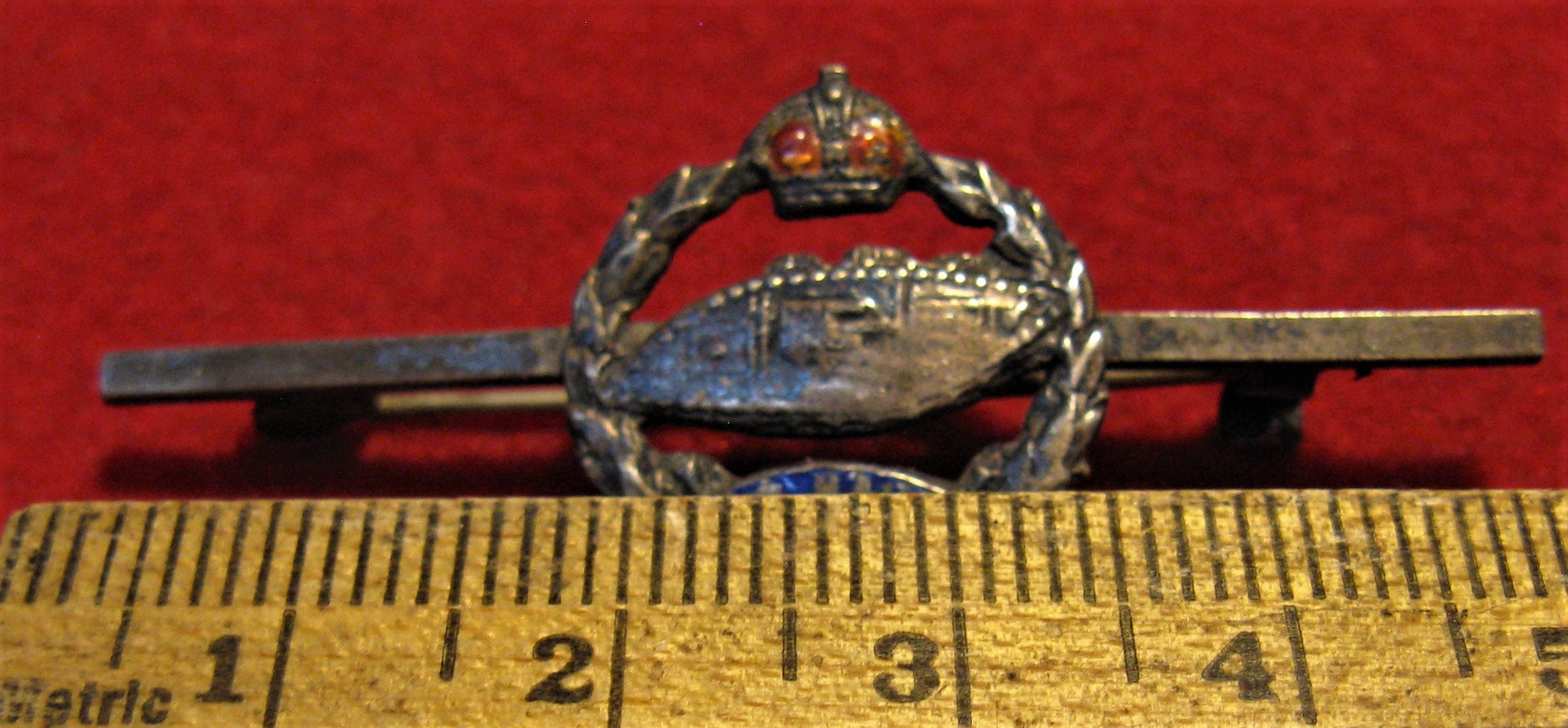 You are viewing a British Armored Corps sweetheart clasp. It has a King's Crown and a shape which suggests a WW2 era vintage. Badge is made of sliver with a red enameled crown and a blue enameled scrolling underneath which reads "Fear Naught". The badge is attached to a brass bar and has a straight pin type attachment which is intact and in good order.