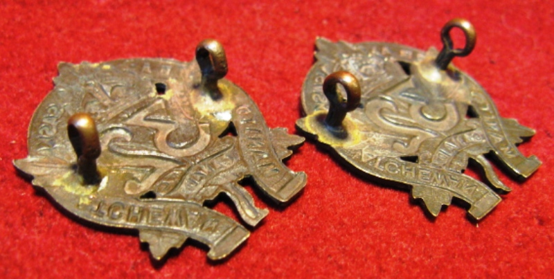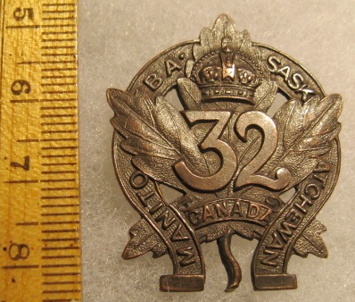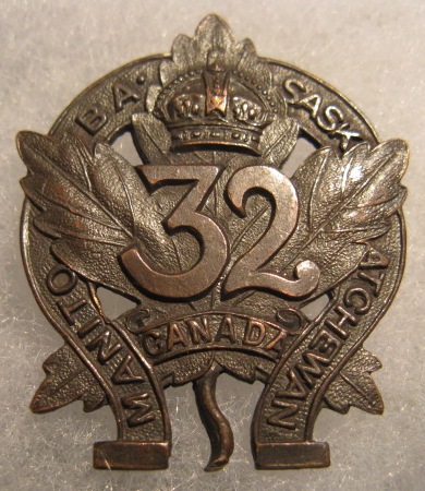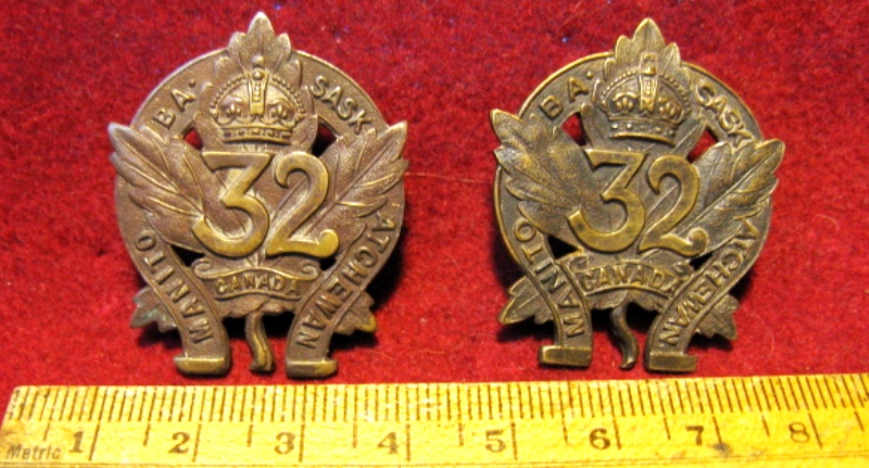 Above are the scans for a WWI 32nd Battalion collar badge. This set of two large browning copper collar badges has all lugs original and in good order. A o/r clean copper badge set with very nice patina giving evidence to its age.