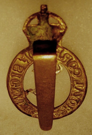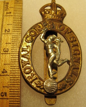 You are viewing a WW1 Royal Corps of Signals Cap Badge. This badge is bi-metal with a silver colored Mercury figure inset on a circle of brass. Both original lug type attachments original and in good order.