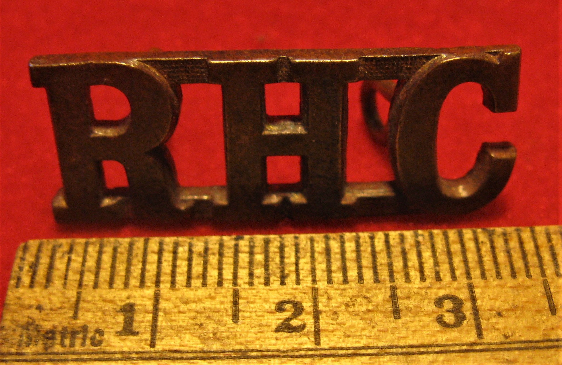 A nice little piece of Canadian military history. This title RHC may be WWI but it stands for Royal Highlanders of Canada (The Black Watch), so I've been told. I'm a little skeptical of this however , and you may know better. Please inform us at creidm@gmail.com . Made of browning copper and comes with original lug type attachments.