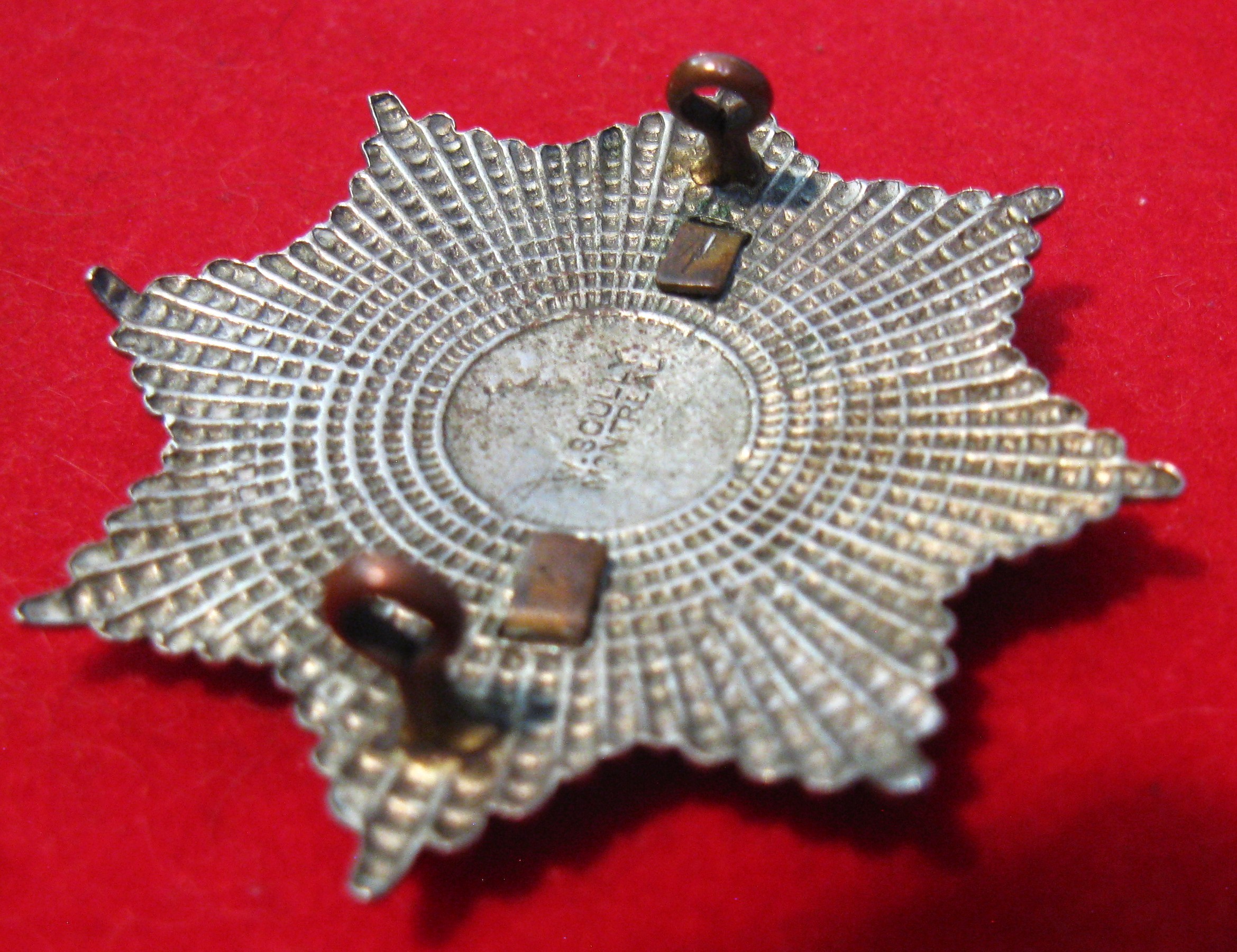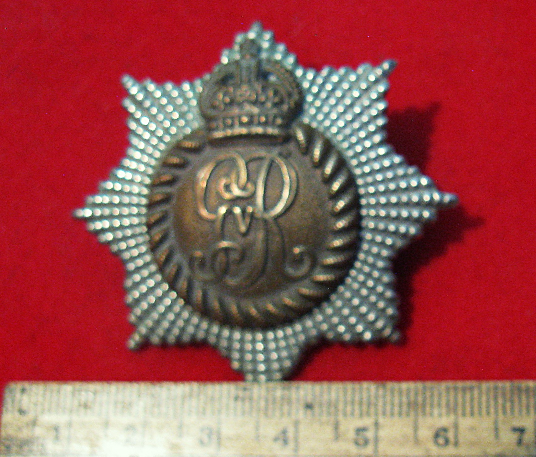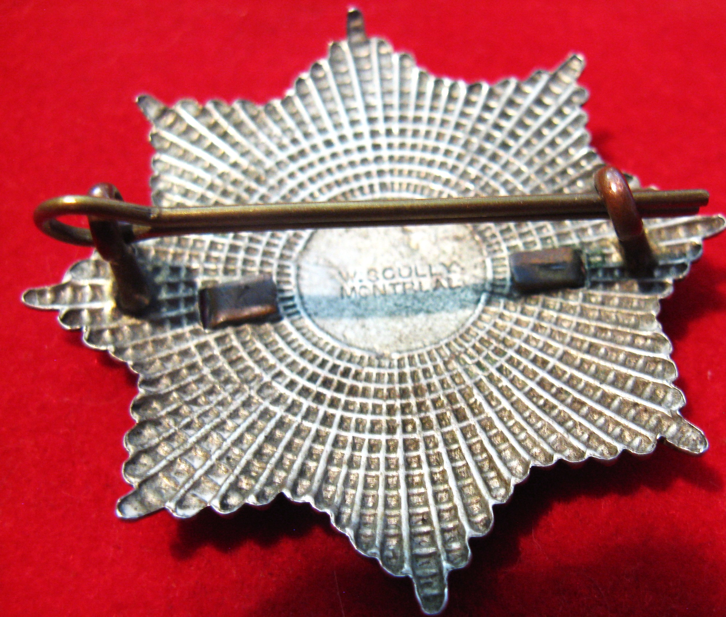 This badge is bi-metal with copper & white metal. Both original lugs are intact and in good order. Comes with its cross pin as found. The badge is hallmarked "W.Scully- Montreal ". Has an George V cypher under the king's crown.