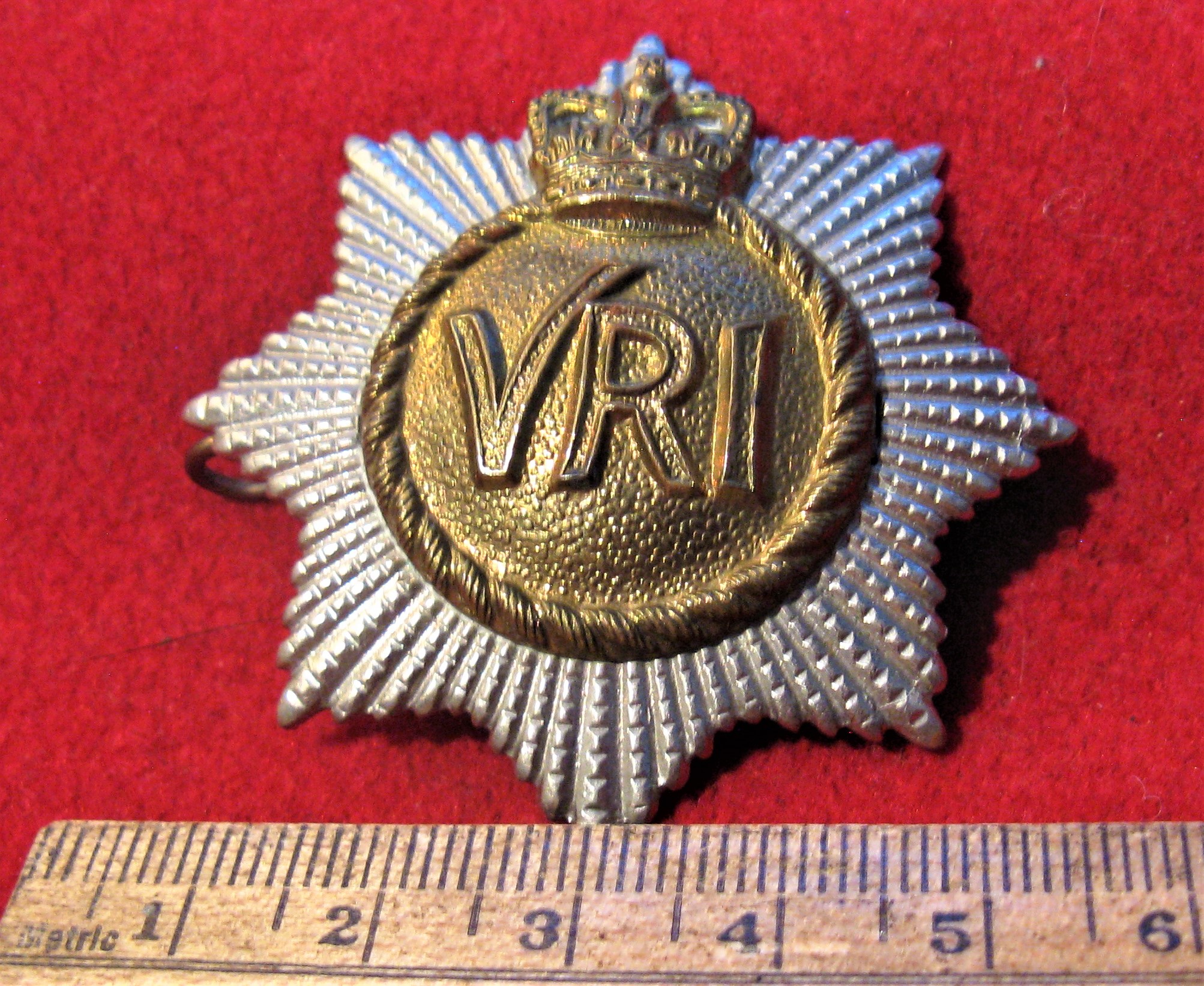 Above are the scans of this excellently preserved Royal Canadian Regiment (RCR) Cap Badge from the WWII era. This clean example has both original welded stem lugs, and cross pin, as found. A typically large solid heavy bi-metal badge still in excellent condition.
