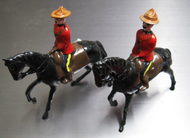 You are viewing Britians ltd. Die-cast Vintage Canadian Mountie figures (lot #2)...It is a hollow cast typical Britains style manufacture. These are original figures in excellent condition,wearing the Stetson & red uniform so well known worldwide. The cornination coaches in the third scan is also available. Contact us by email for those items' details.