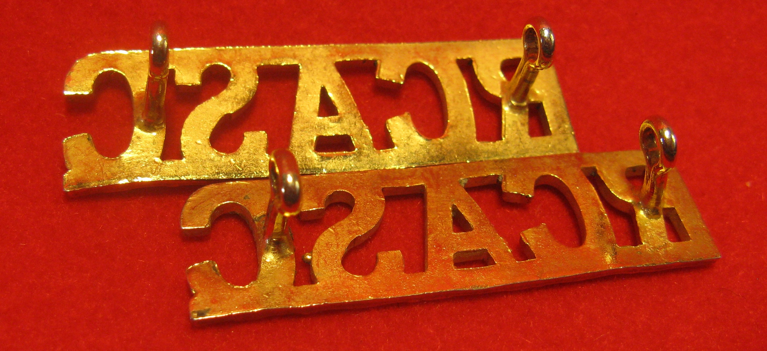Above are the scans for this WWII era "RCASC" (Royal Canadian Army Service Corps) shoulder title set of two. These examples are made of brass. The lettering is similar to the RCHA lettering in that listing. They come with all horizontal welded lugs original and in good order.
