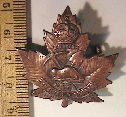 You are viewing a CEF WWI era 1st Canadian Pioneers Collar badge. Made of copper, withlug typefasteners. (1 is original andintact. The other is missing).Very goodcondition, complete with no chipping or damage to the design features.Has a beaver over pick & shovel design. Measures approx3 cm across. The Canadian Pioneer battalions served closely with the Canadian Engineer battalions, but doing much of the communications construction. Most pioneer battalions were absorbed into the Engineers by 1917. The only one which remained after that time was the 1st Pioneer Battalion of which this badge is an example. Guaranteed 100% genuine. We prefer US$ which is what our items are listed in.Forcredit cardpayment over the phone: 1-403-262-2397 (1:00pm to 6:00pm Monday through Saturday - mountain time!) or by email at creidm@gmail.com .We will also accept Paypal; click the link below. Notethat you must assume responsibility for loss in shipping if you declineour tracking / insurance offer. I will happily combine items to save shipping costsif you purchase other items as well... Please keep in mind that on all our products we accept prepaid authorized returns within 14 days of shipping, for full product credit, if you are not satisfied.