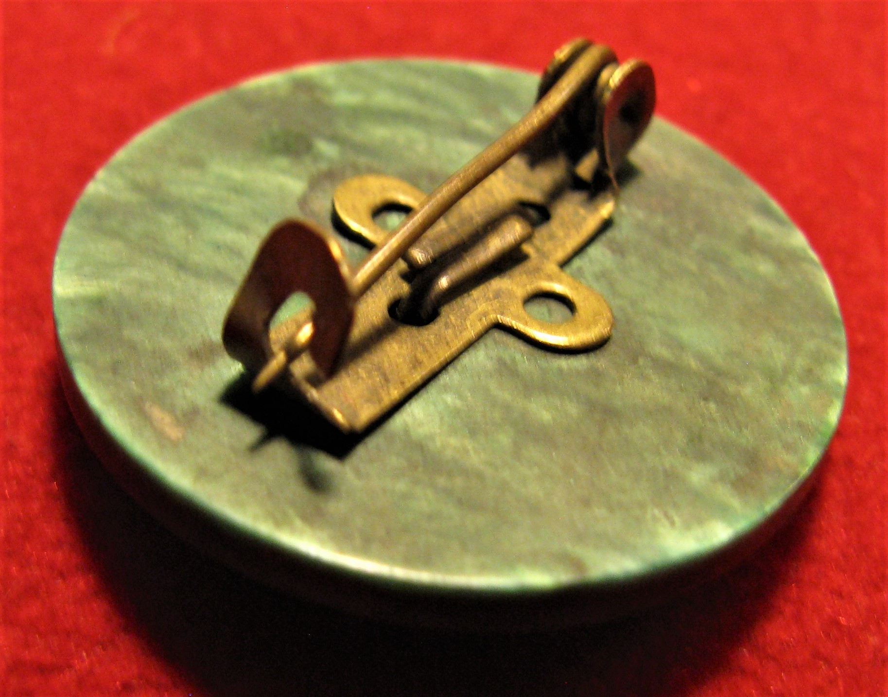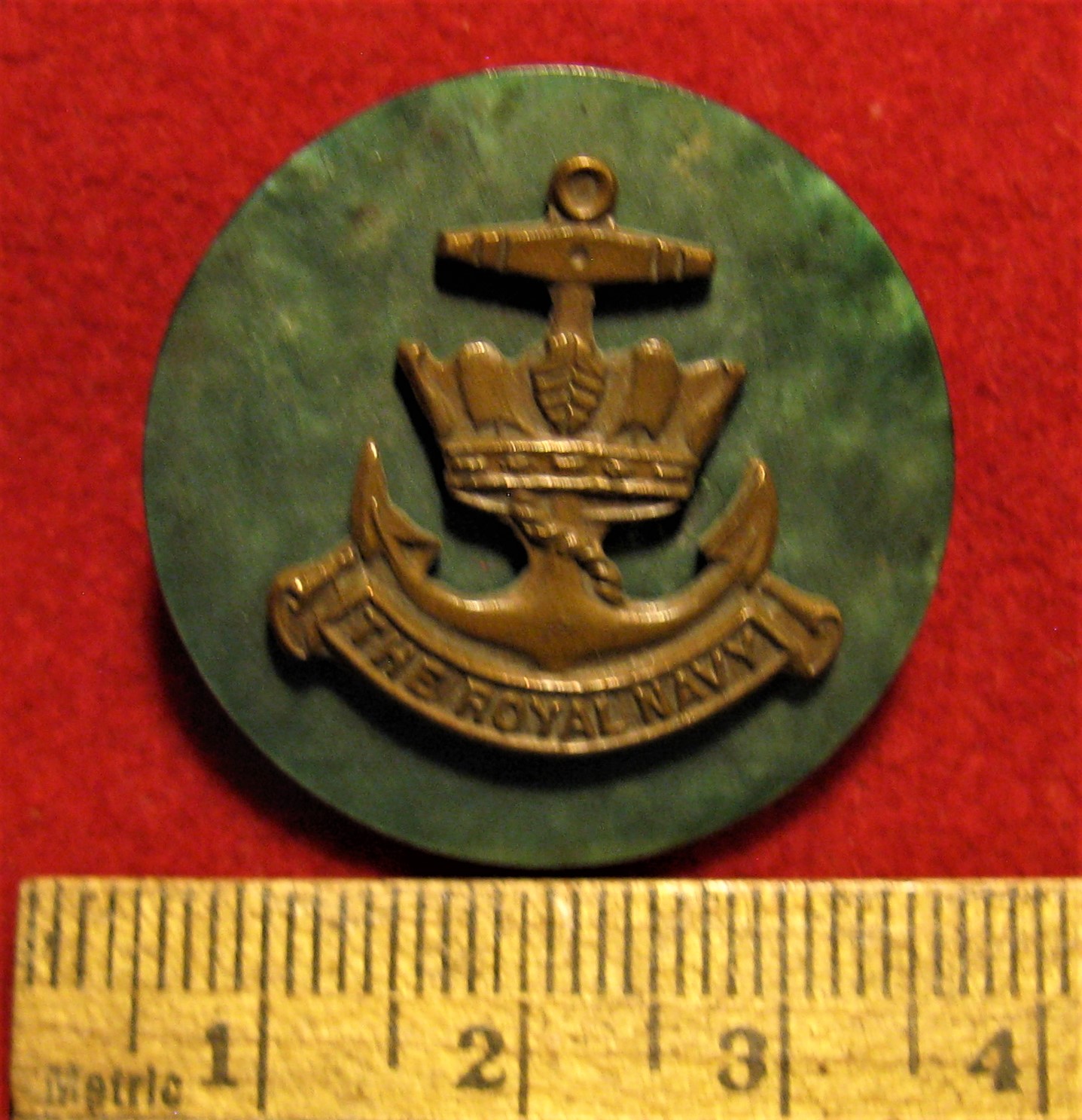 You are viewing a wartime Royal Navy Sweetheart pin. This pin is has a browning brass crown and anchor motif above a scrolling of "The Royal Navy", all set on a green bakelite roundel. The attachment on the back is in good order...