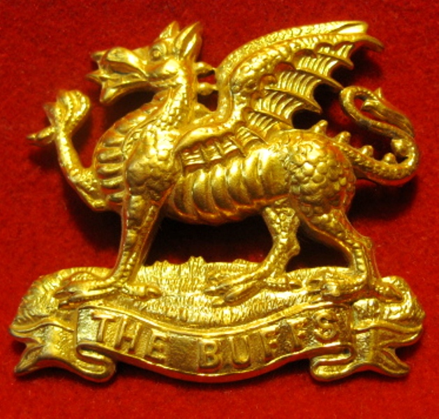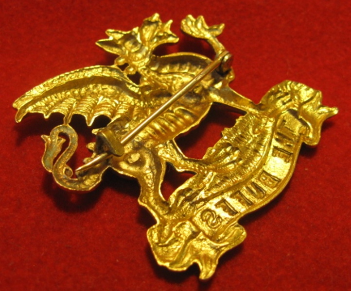 You are viewing a WWII era Regimental Cap badge for the "Buffs". This is the 198 C variety as shown in Charlton book. This badge is made of brass, overlaid with gilt finish. Has straight pin type attachment , suggesting officer grade. It is functional and in good order. Has a high quality design with no chips or dents.