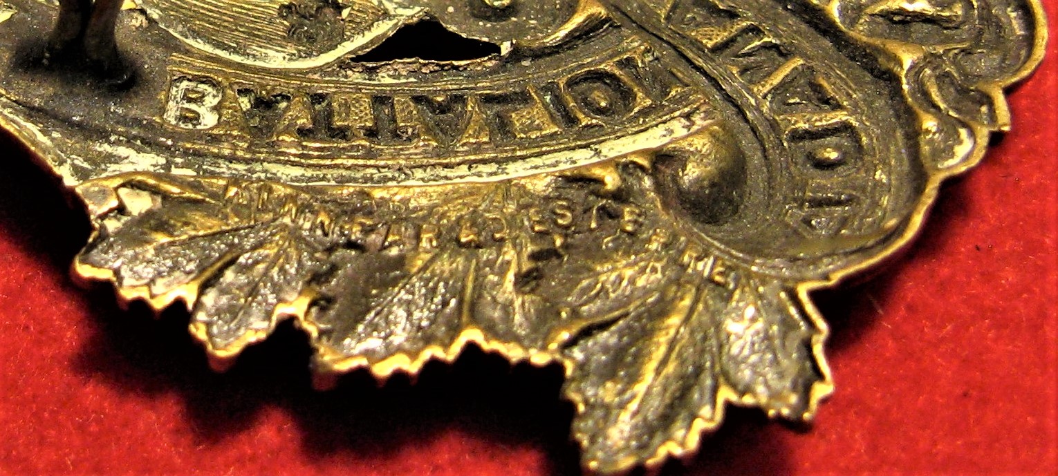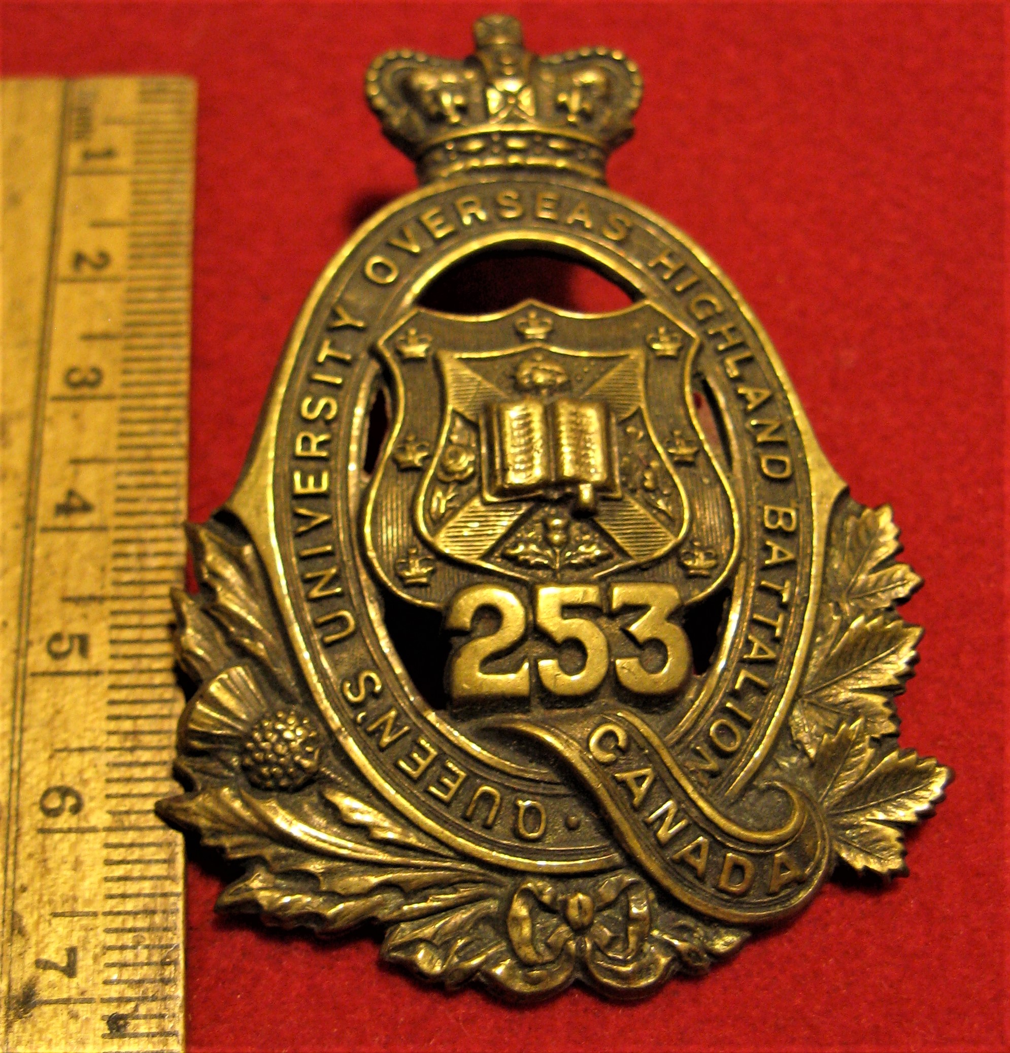 You are viewing a vintage CEF WWI era 253rd Battalion Cap badge. This battalion was called the "Queen's University Highlanders". The rare badge is made of brass, with both original horizontal lugs in good order. A beautiful design on the rather large badge, with a Victoria style crown over top. Note the Queen's University crest just above the number. Hallmarked "Kinnear & ...??" (view scans). This battalion was raised from members in Eastern Ontario, with headquarters in Kingston during July of 1916. They sailed for England on April 29th, 1917. A small battalion of only 478 members (low badge count). Upon arrival the 253rd became part of the 5th Reserve battalion.