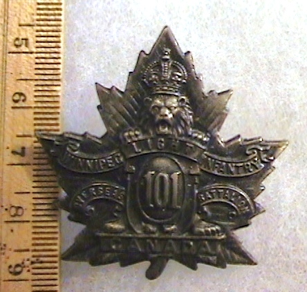 You are viewing a vintage CEF WWI101st Battalion Cap badge. Thisbrowing brassbadge is complete, with both originalhorizontal lugs in good order. This is a high quality design with no chips or dents ro flaws. It shows in the scrolling across the center, its home regiment name "Winnipeg Light Infantry". No maker mark noted.. This battalion was raised in Manitoba, with headquarters in Winnipeg,during thewinter of 1915.Thiswas alarger battalion, with1061 members. The101st sailed for England on June 29th, 1916. Upon arrival they became part of the 17th Reserve Battalion, supplying replacements at the front...
