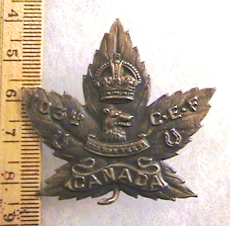 You are viewing a vintage CEF WWI103rd Battalion Cap badge. This British Columbia badge is made of plated white metal, with both originalhorizontal "flat" (early type)style lugs in good order. This is a high quality leaf design with no chips or dents ro flaws.Note the twosmall horse shoes on thisbeauty.This battalion was raised in British Columbia, with headquarters in Victoria,during thewinter of 1915.Thisbattalion,had976 members. The103rd sailed for England on July 24th, 1916. Upon arrival they became part of the 16th Reserve Battalion. Guaranteed 100% genuine. Our items are listed in US dollars.Forcredit cardpayment over the phone: 1-403-262-2397 (1:00pm to 5:00pm Monday through Saturday - mountain time!) or by contact us by email at creidm@gmail.com .We will also accept Paypal; click the link below. Notethat you must assume responsibility for loss in shipping if you declineour tracking / insurance offer. I will happily combine items to save shipping costsif you purchase other items as well... We accept prepaid authorized returns within 14 days of shipping, for full product credit, if you are not satisfied.