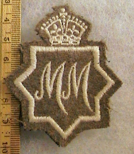 You are viewing the scans of this WWI uniform badge. Don't know much about this particular badge but I believe it may be British. "MM" may represent "Motor Machine gun". It is, however a beautifully preserved example of a bygone era. Made of embroidered khaki wool with a black cheese-cloth backing.